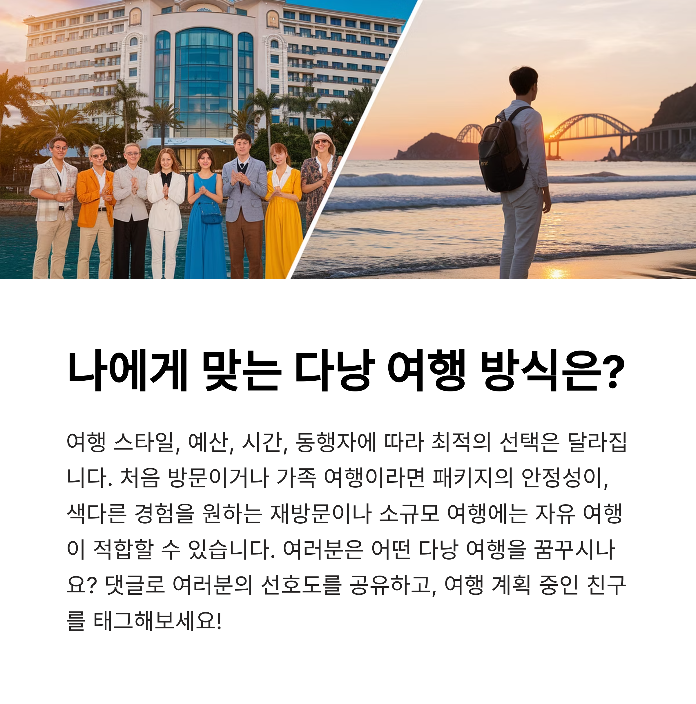 다낭은 패키지와 자유 여행 모두에서 충분히 즐거운 추억을 선사할 수 있는 완벽한 여행지입니다.