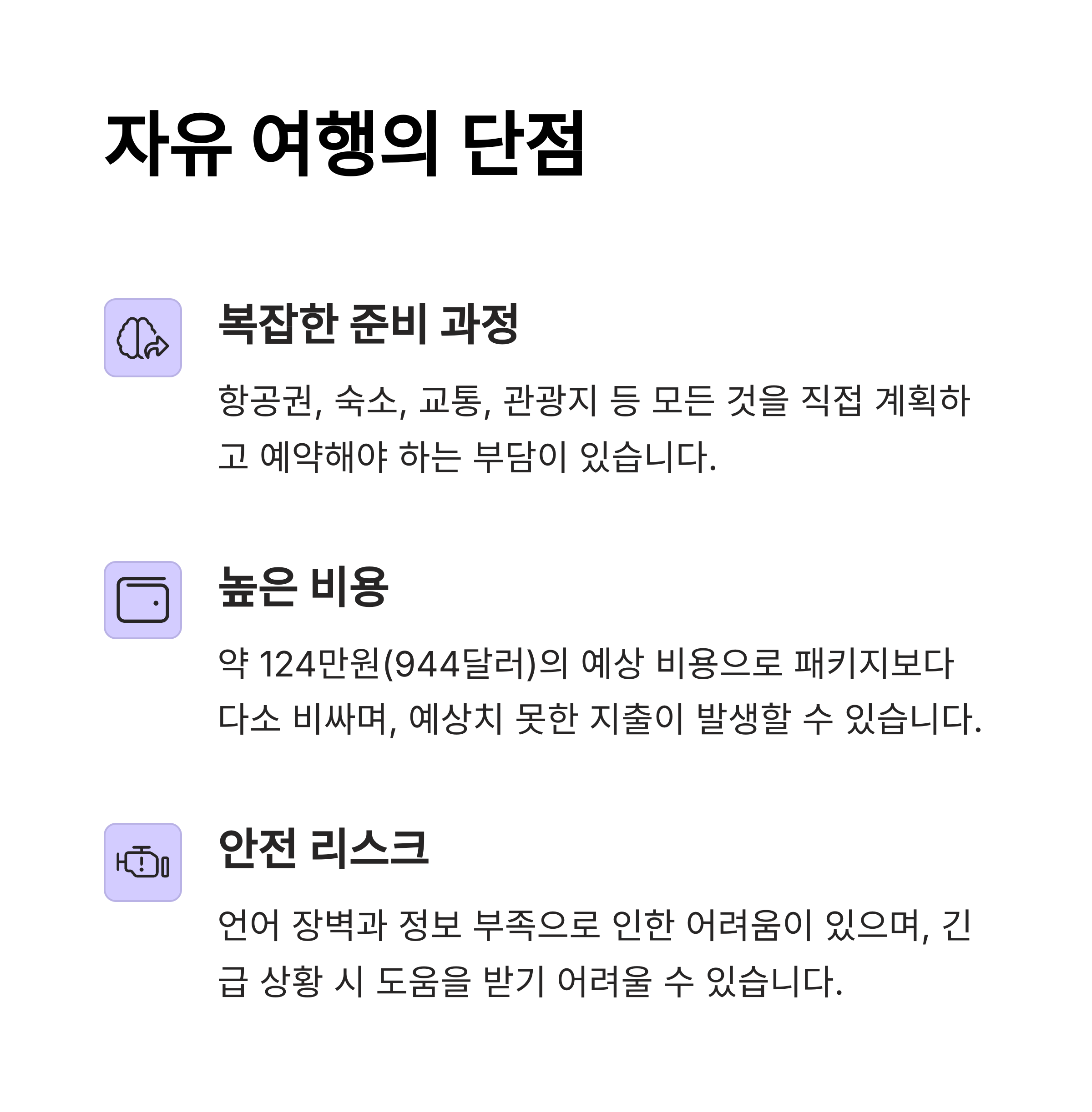 자유 여행에서는 특정 숙소와 항공권이 미리 예약되지 않은 경우 비용이 급격히 증가할 수 있습니다.