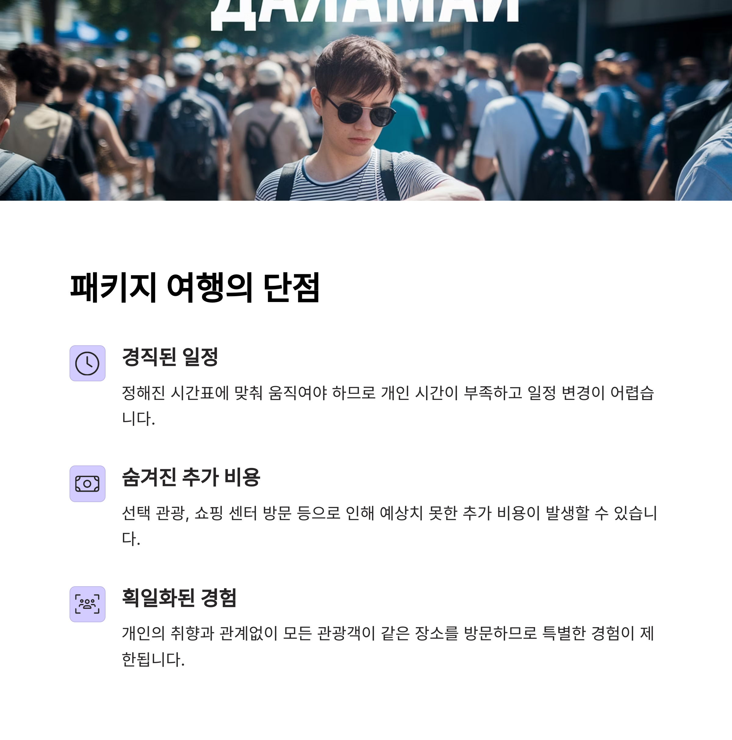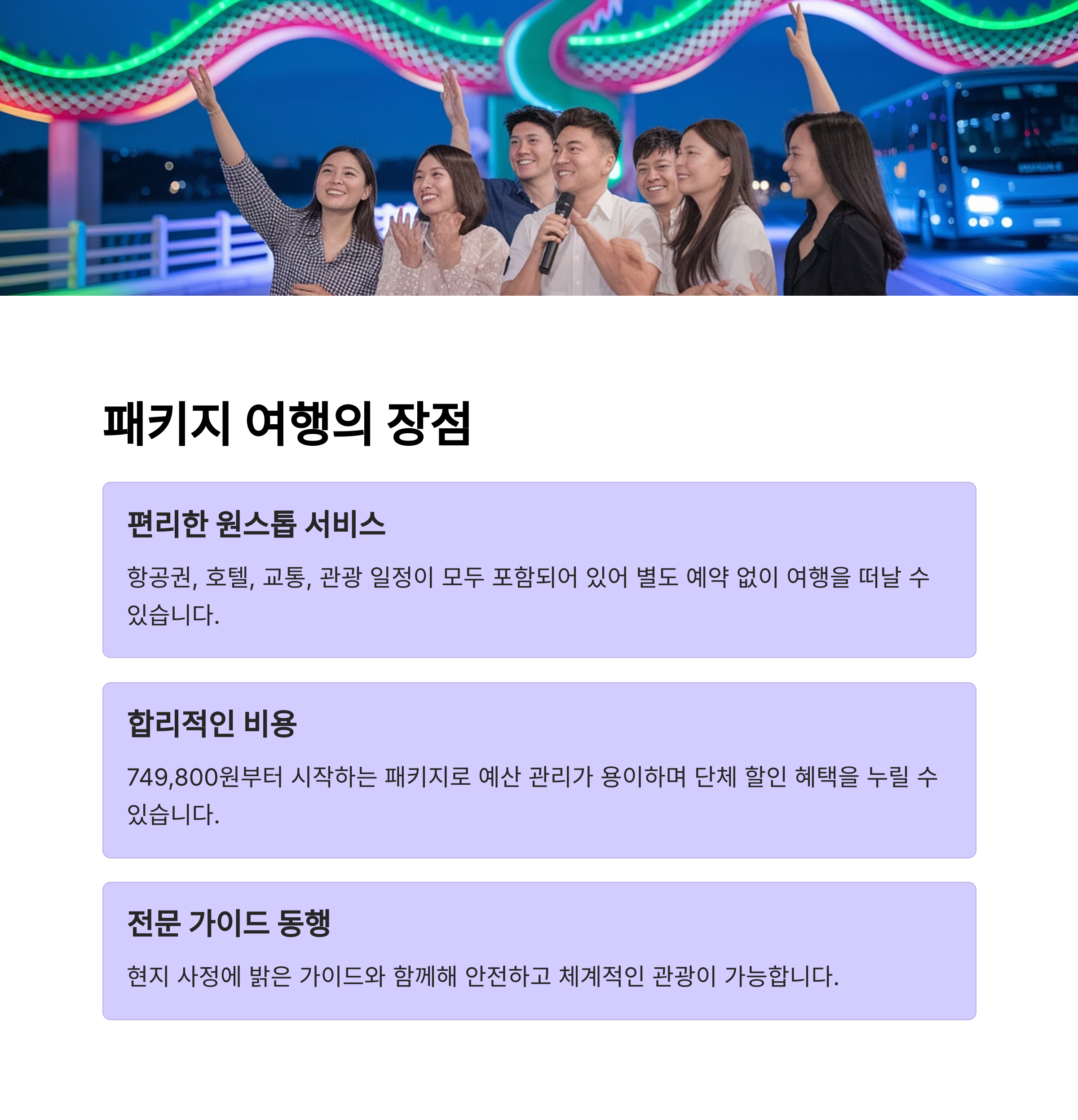 이처럼 비용 안정성이 중요한 분들은 패키지 여행이 더 좋은 대안입니다.
