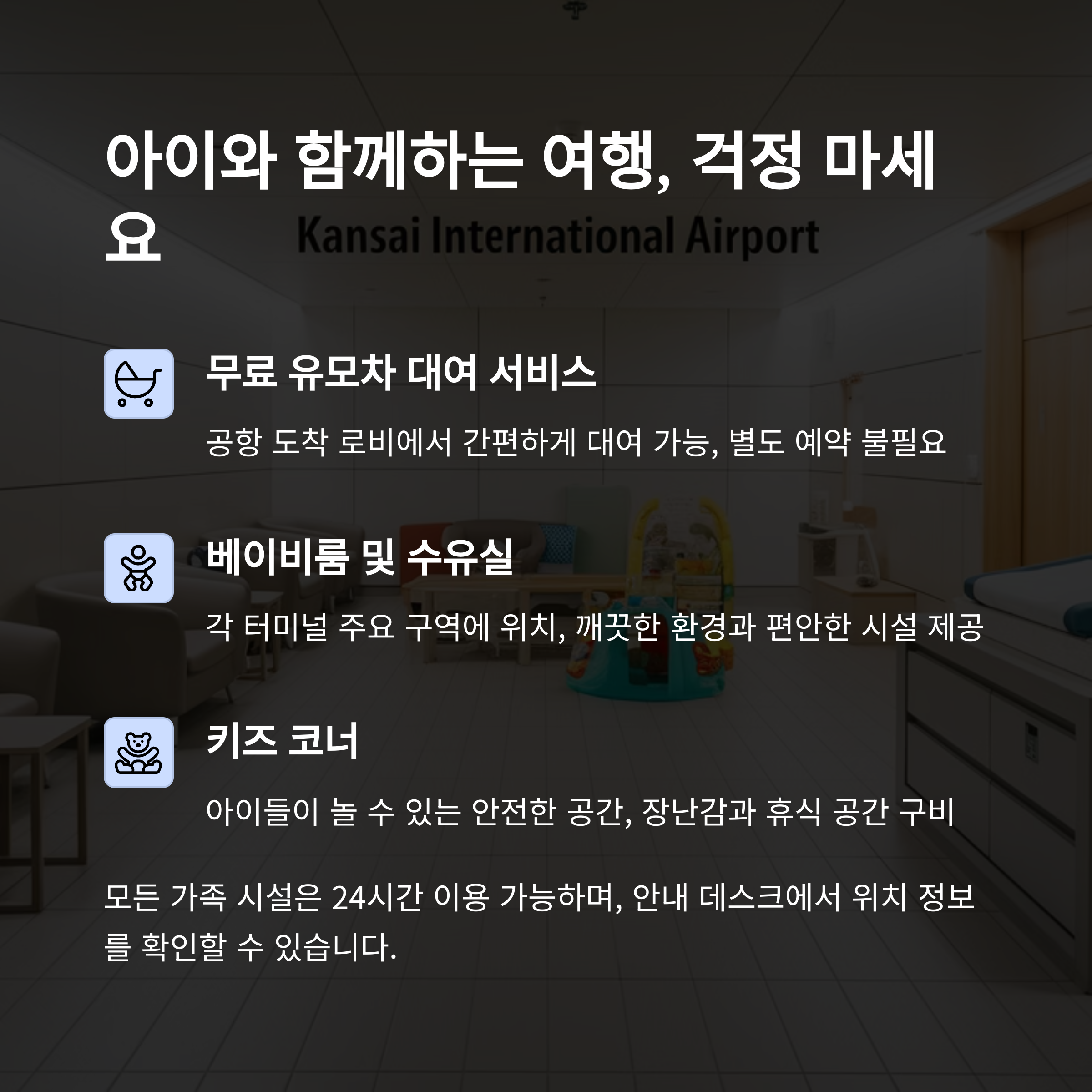 아이와 함께하는 여정이라면 공항의 베이비룸과 다양한 편의시설을 활용해보세요.