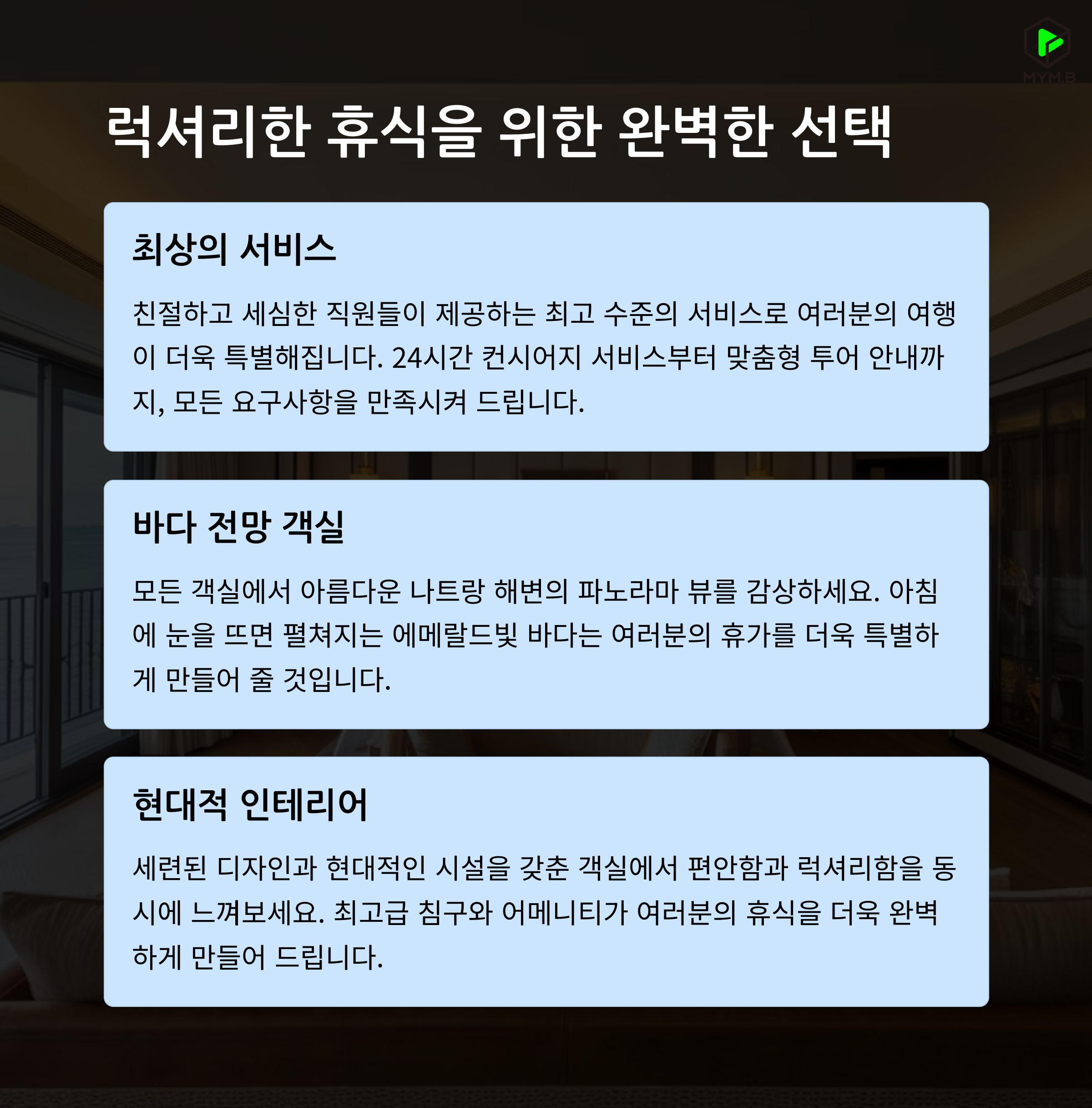 오션뷰와 친절한 직원의 서비스는 편안함과 감동을 선사합니다.