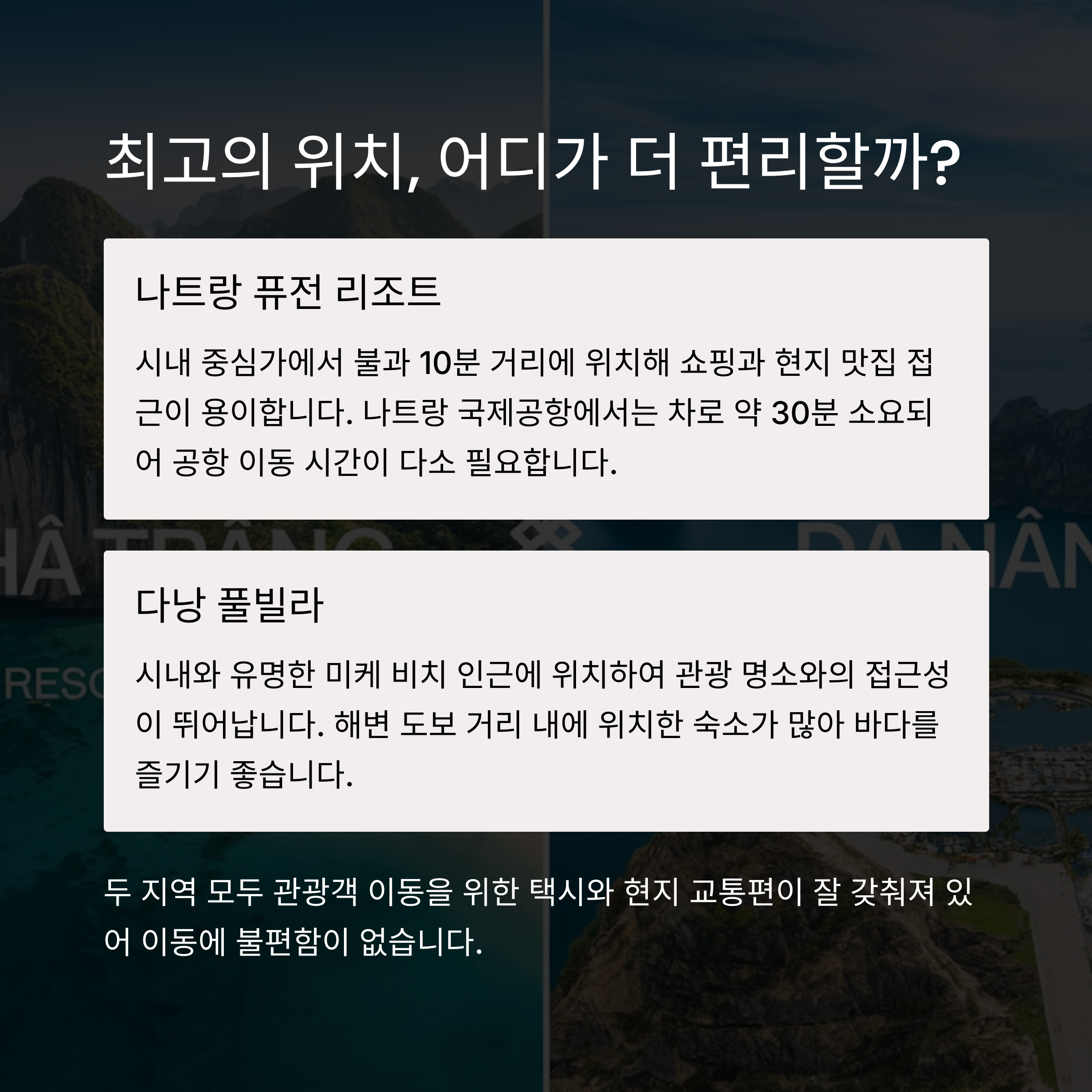 | Q. 나트랑 퓨전 리조트와 다낭 풀빌라의 현지 접근성 차이는? |