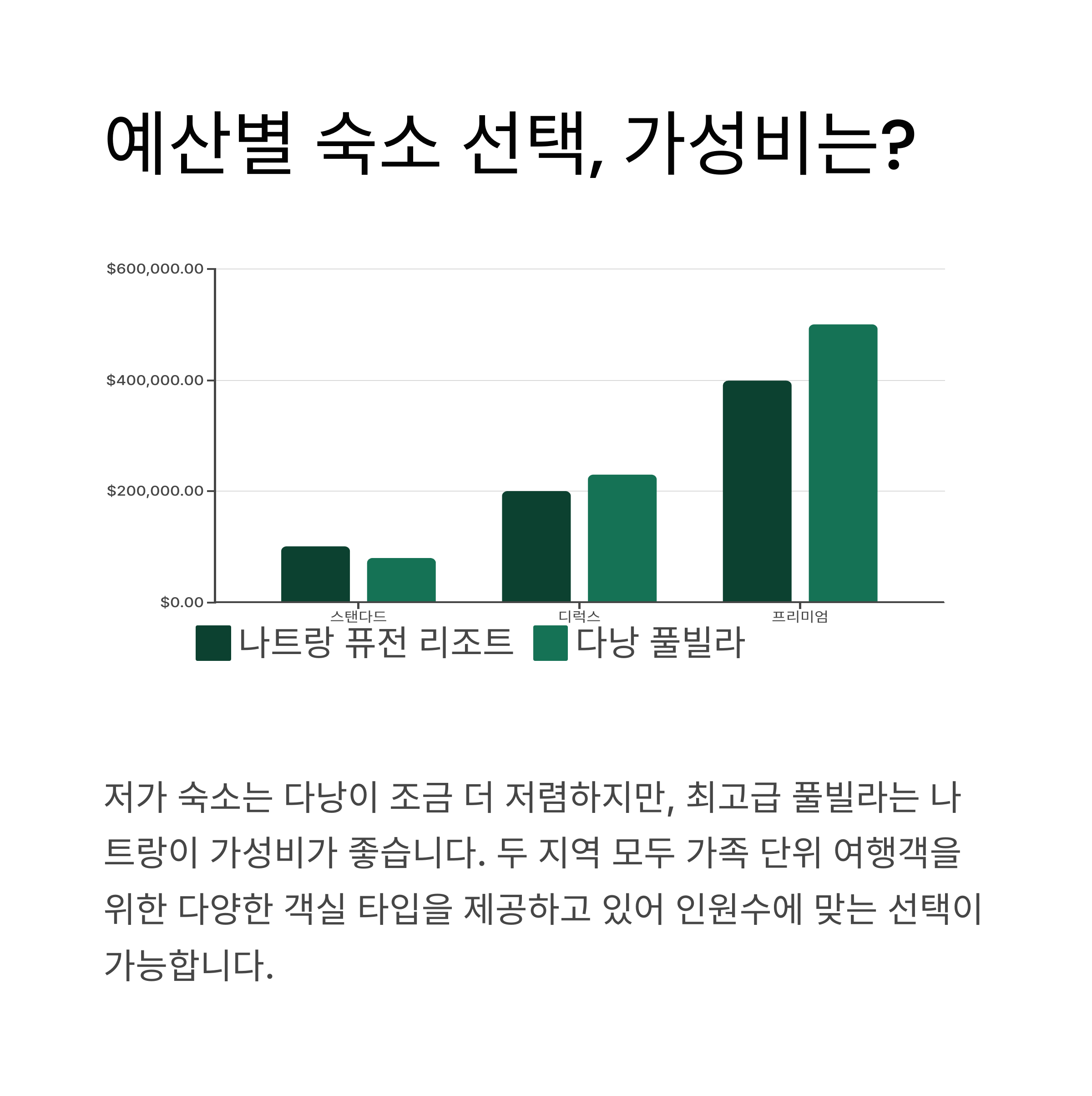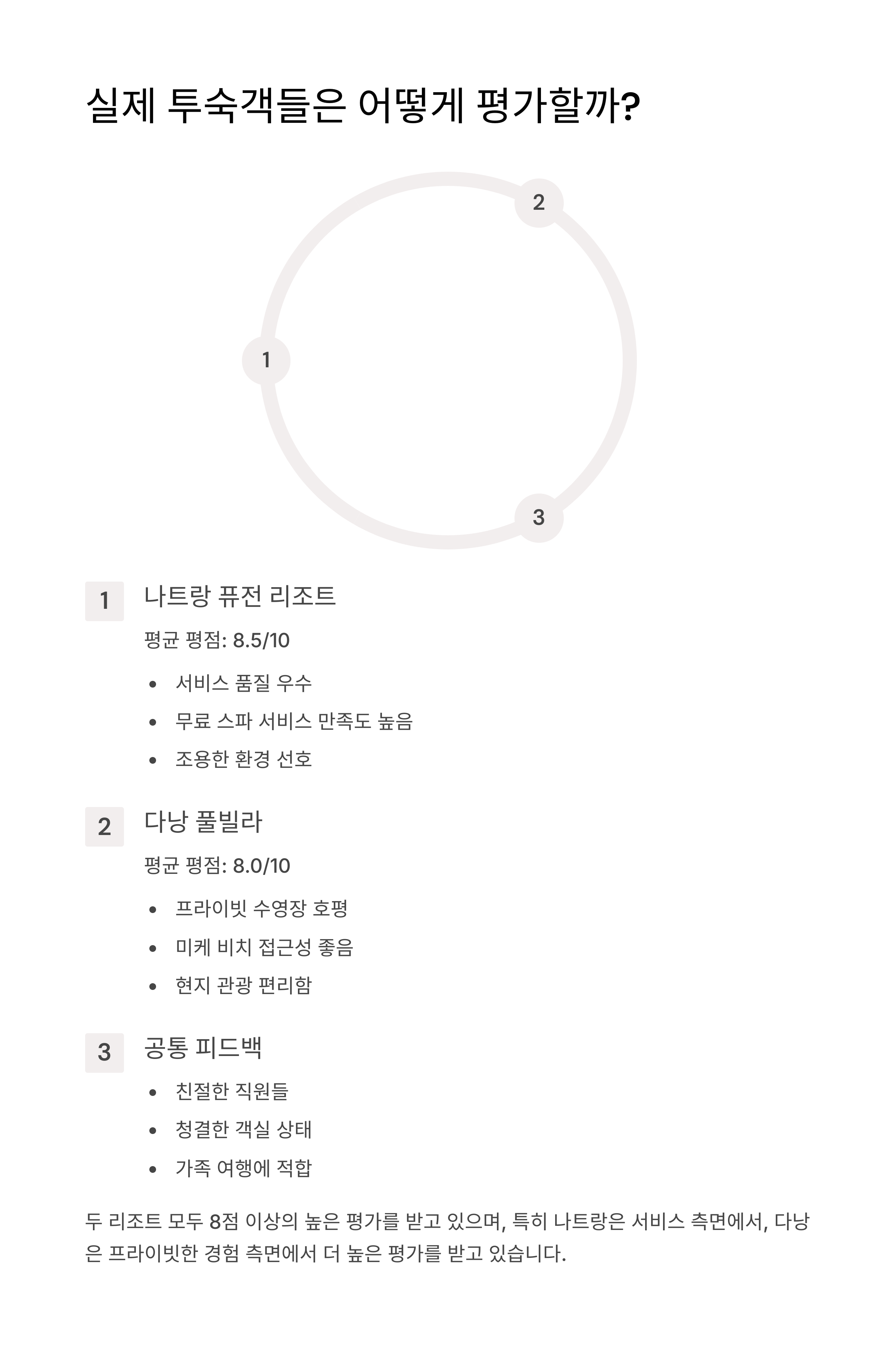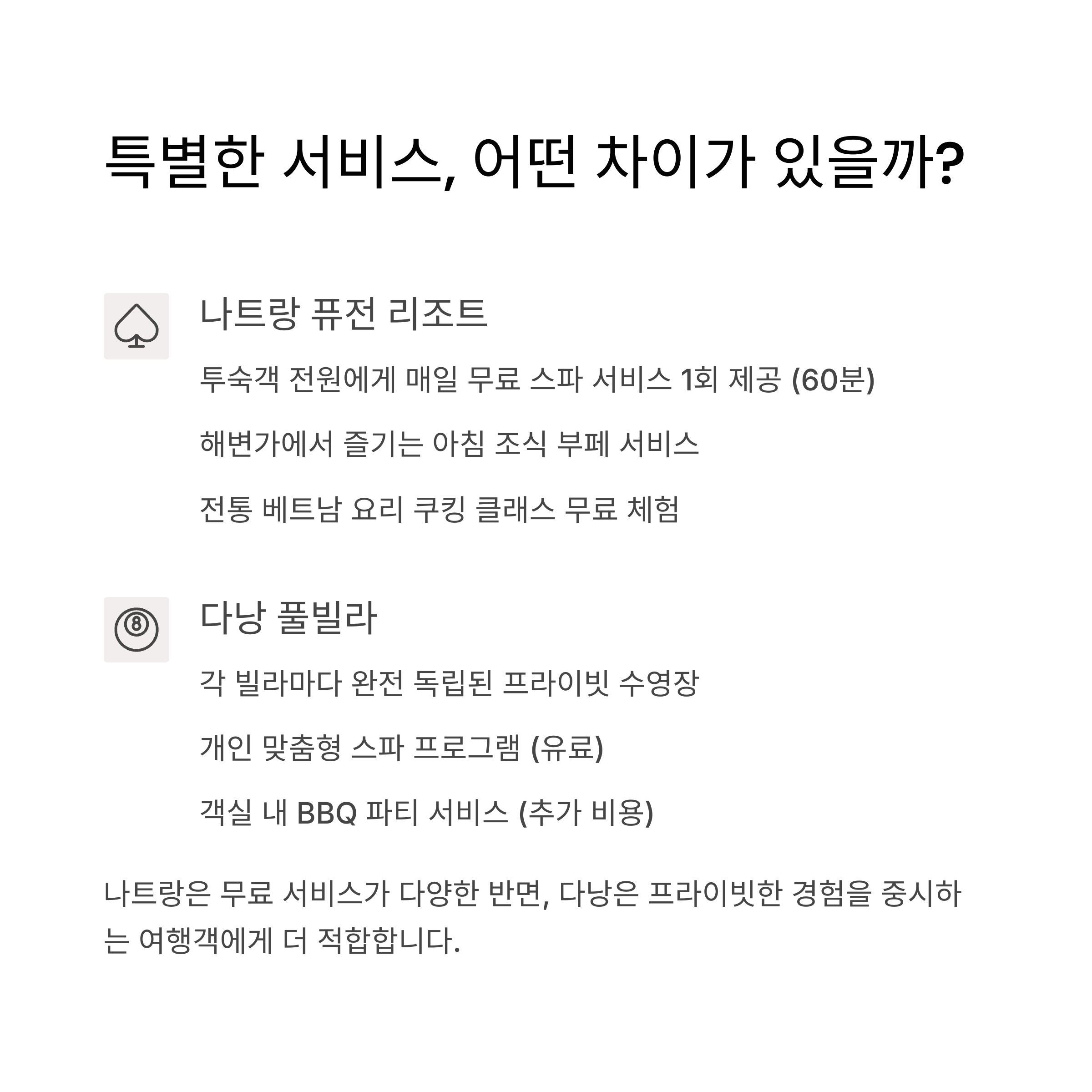 나트랑 퓨전리조트와 다낭 풀빌라의 숙소와 서비스 등을 분석하면서, 두 여행지 사이의 특장점을 뽑아보겠습니다.