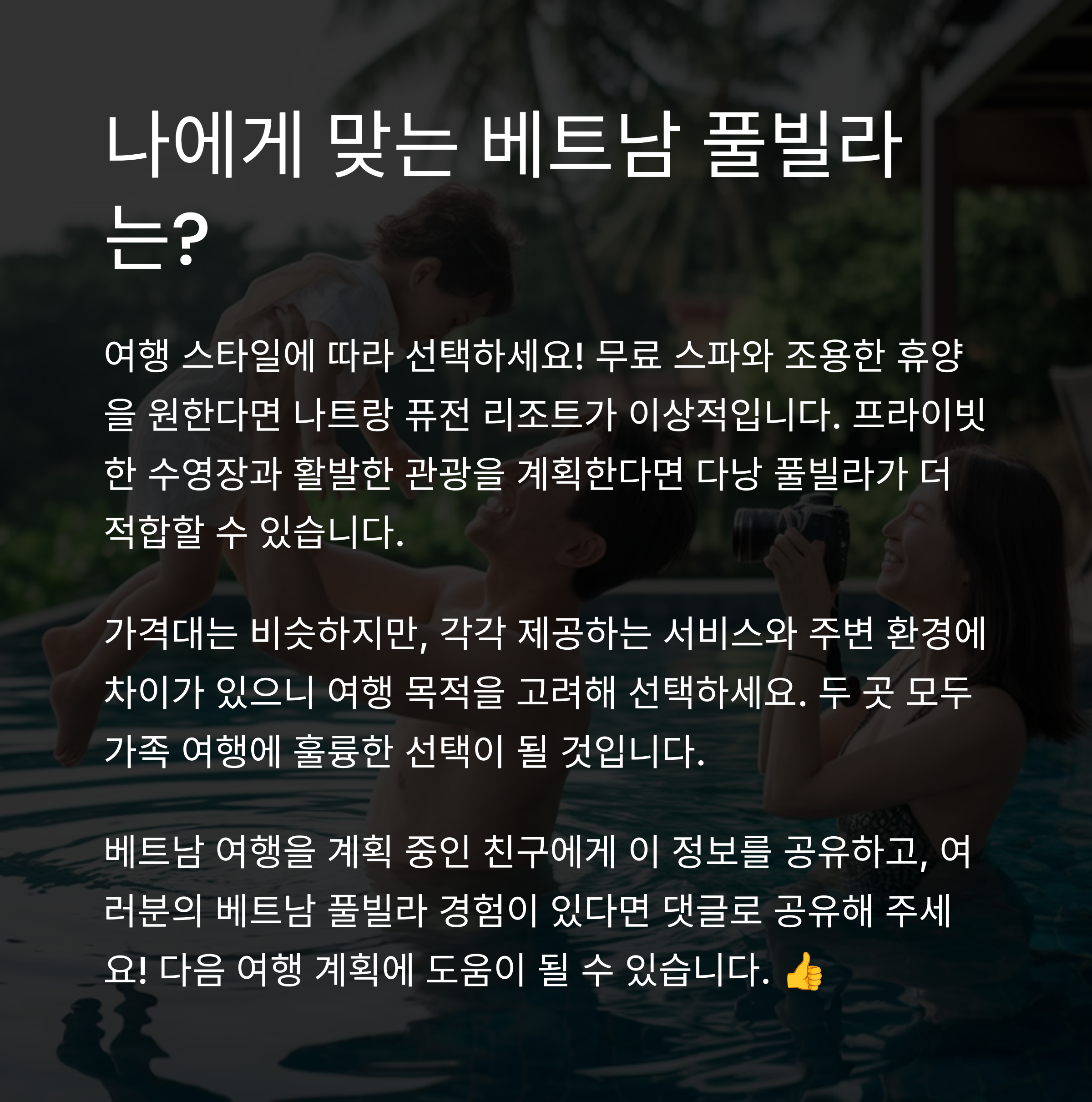 자연에서의 여유로운 시간을 선호한다면 퓨전 리조트 나트랑을, 보다 역동적인 여행을 원한다면 다낭 풀빌라를 추천합니다.