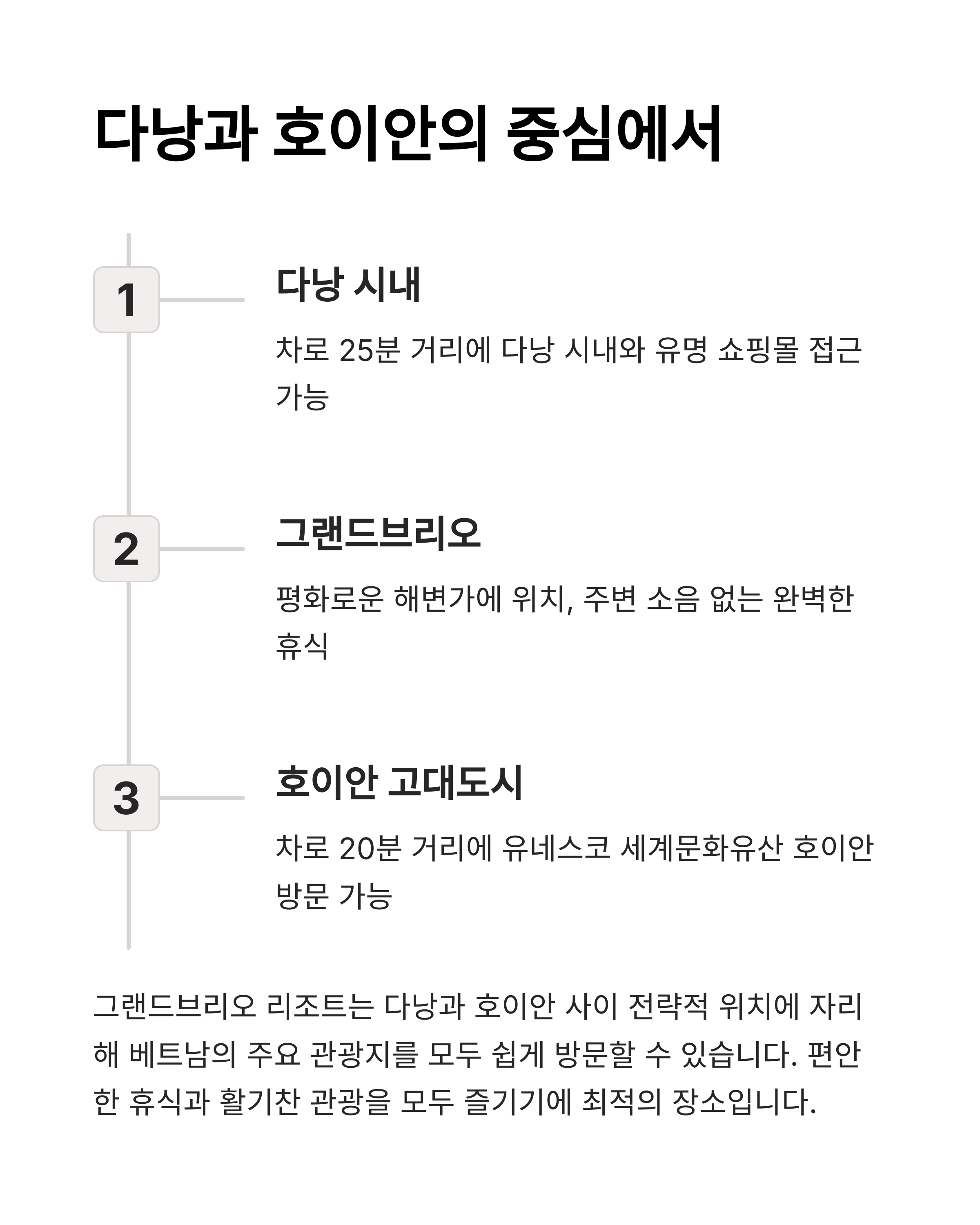 다낭 및 호이안 중심지와의 거리도 가까워 이동이 편리하며, 주변에 다양한 관광 명소가 위치해 있어 액티비티를 즐기기에 좋습니다.