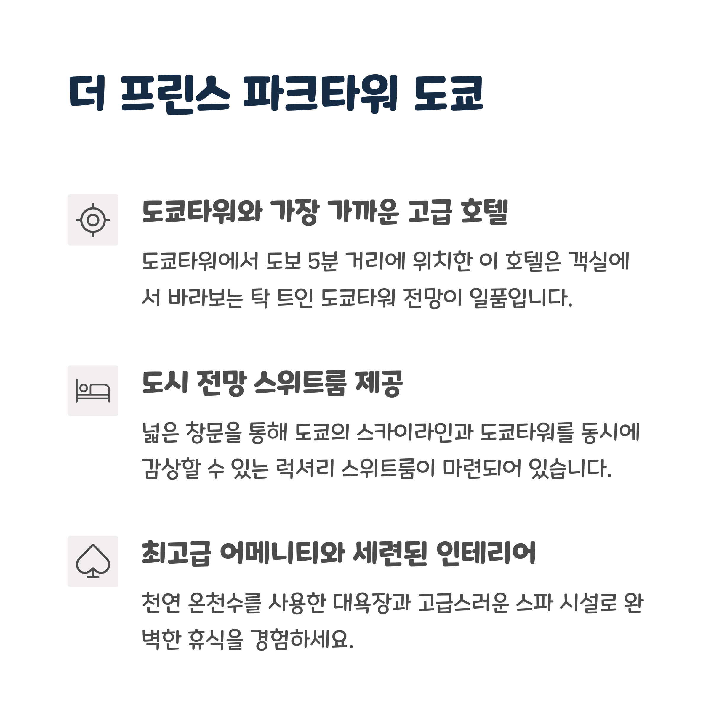 접근성 또한 중요한 고려 요소로, 대부분의 호텔이 도쿄타워와 10분 이내의 위치에 있습니다.