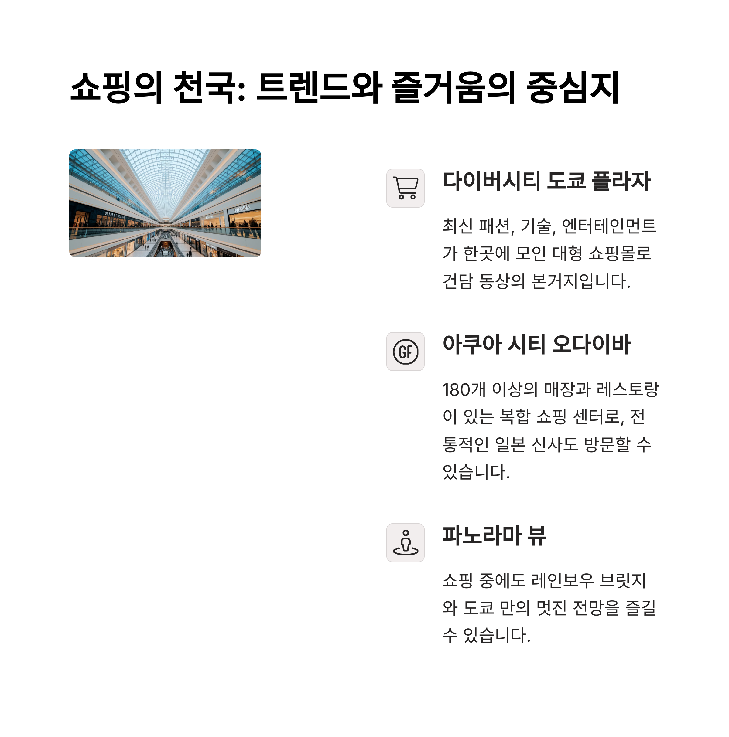 도쿄 오다이바 여행에서 하루를 준비한다면, 위 콘텐츠가 값진 가이드가 될 것입니다.
