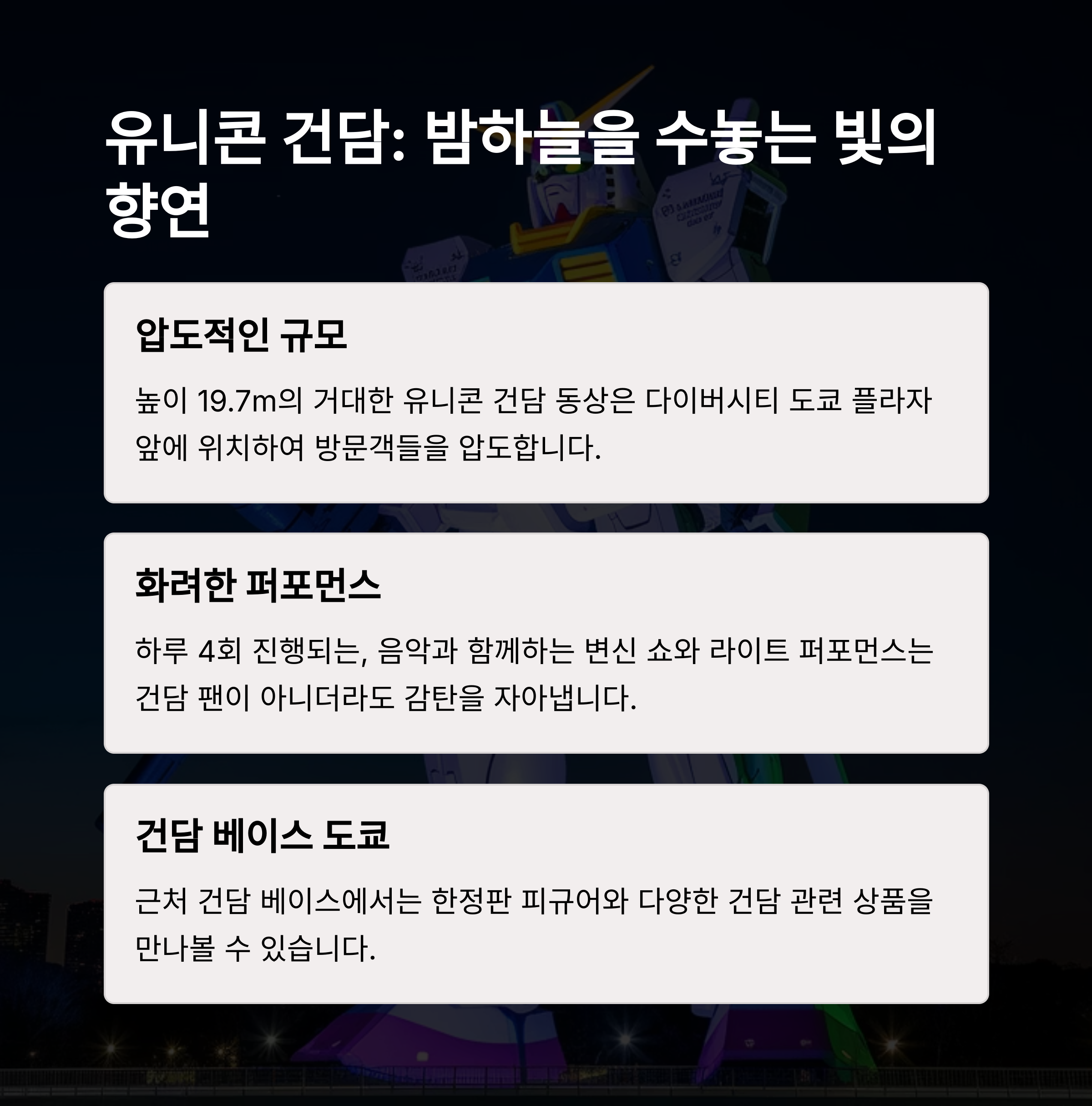 밤 조명 쇼와 독특한 건담 모델 변형은 특별한 경험을 제공합니다.