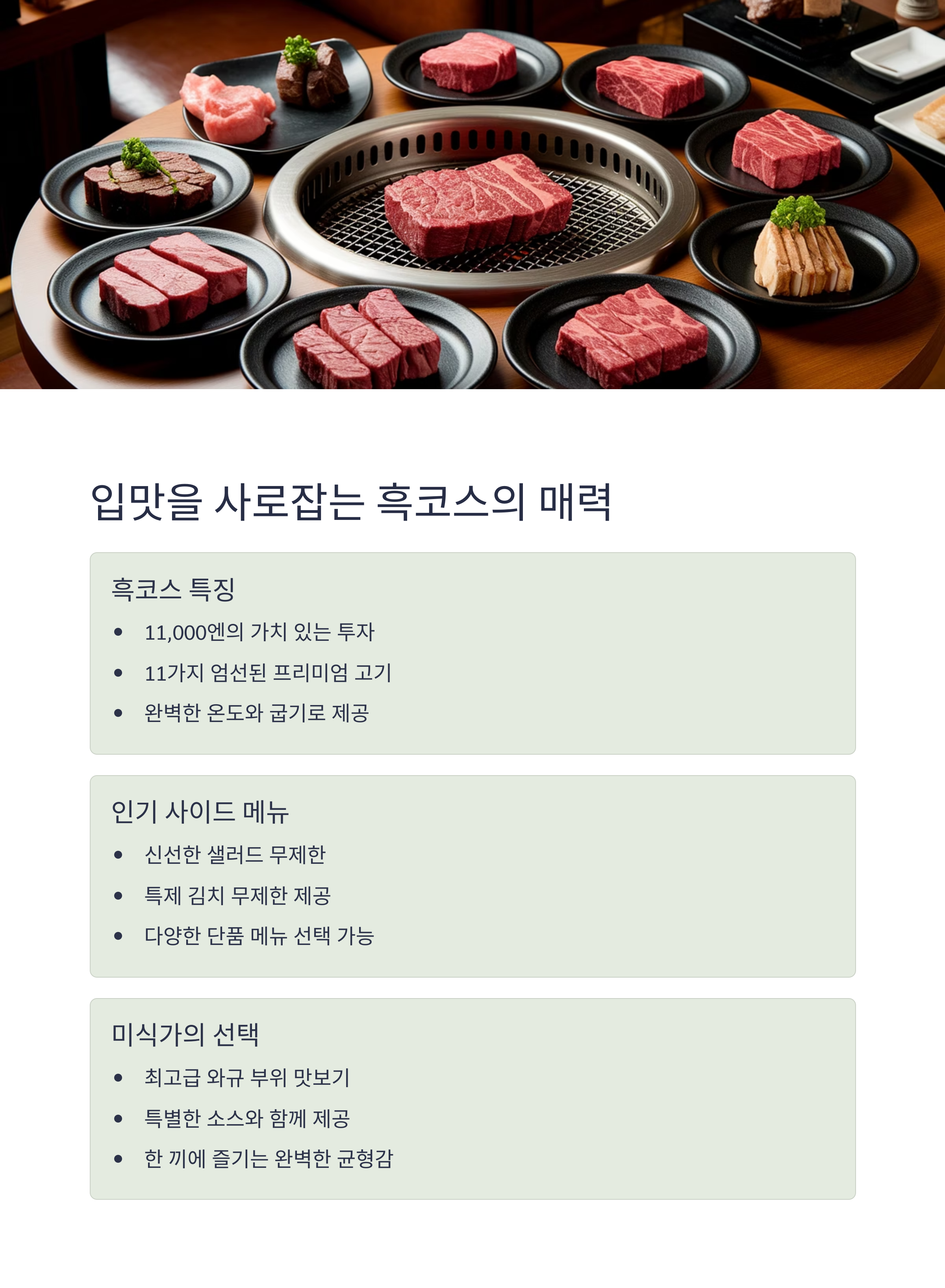 야키니쿠 키타마츠의 흑코스는 고급 재료와 독창적인 조리법으로 구성되어 큰 인기를 끌고 있습니다.