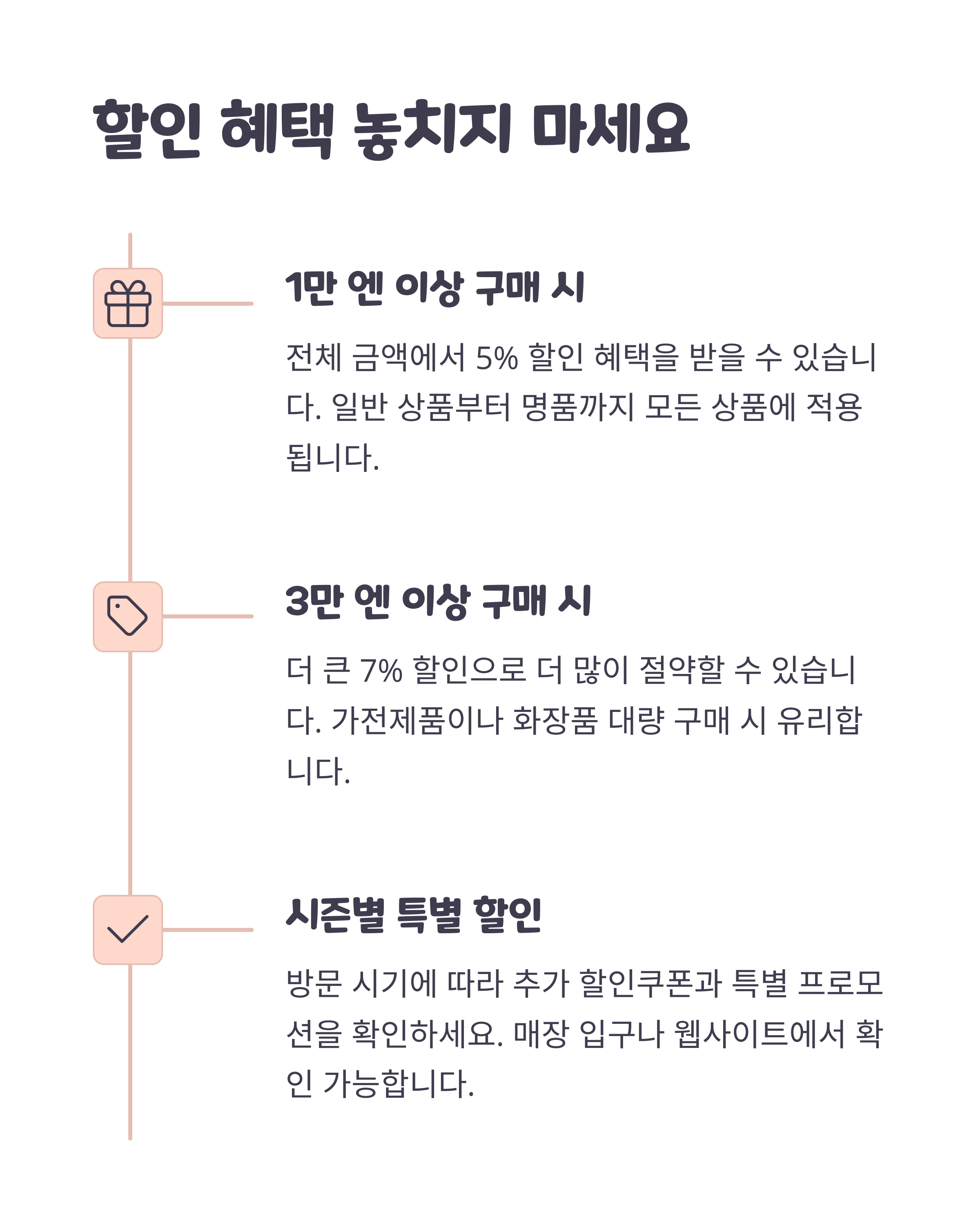 구매 금액과 조건을 충족하면 최대 10% 소비세 절약이라는 실질적인 혜택을 받을 수 있습니다.