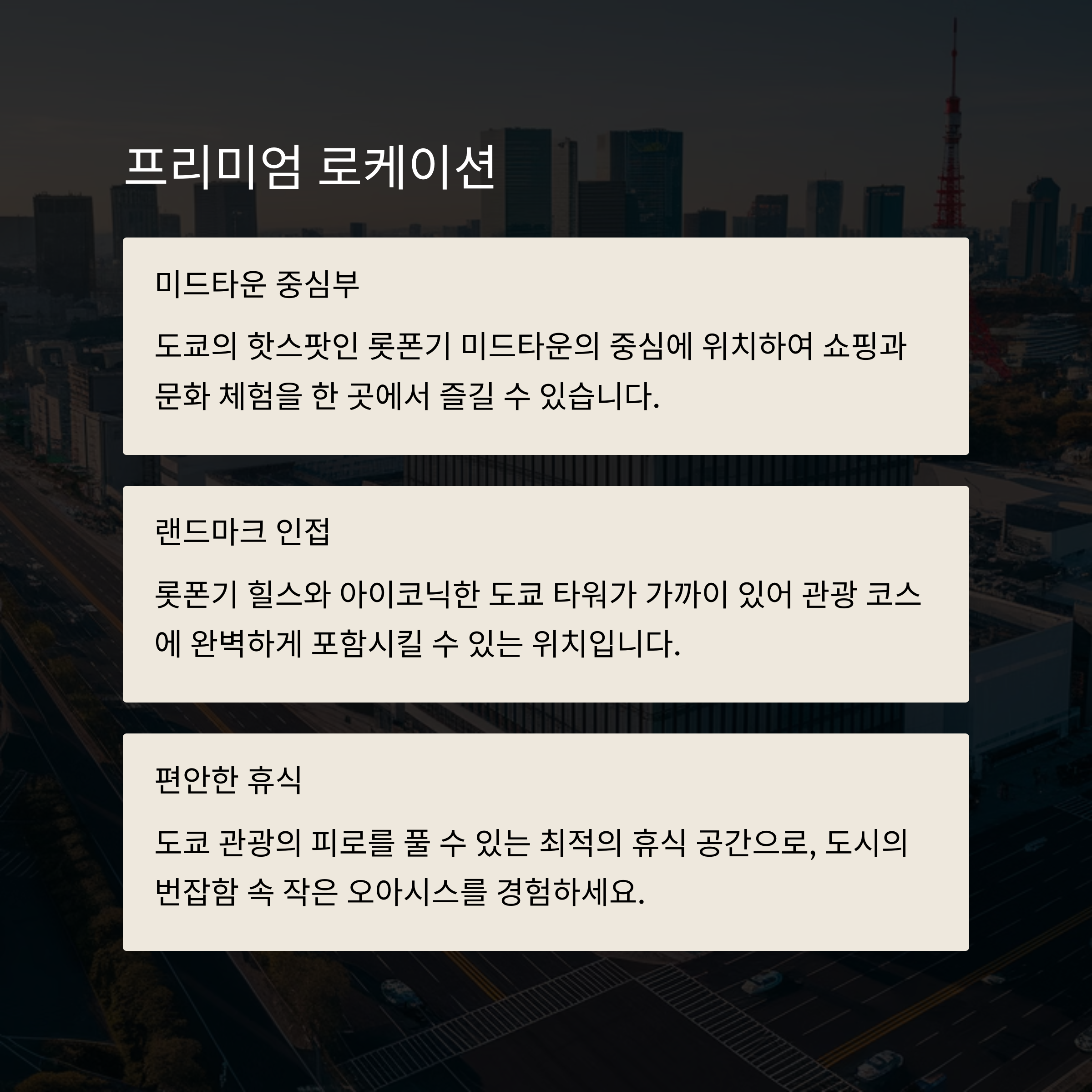매장 위치는 롯폰기 미드타운으로 교통 접근성이 매우 좋습니다.