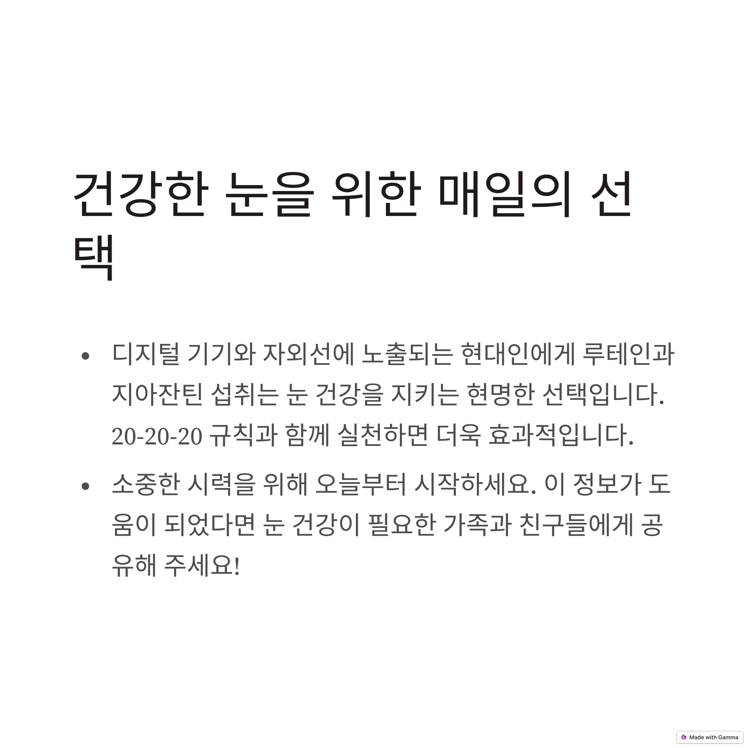 • 권장 섭취량(루테인+지아잔틴 합산 20~24mg)을 초과하지 않도록 주의하세요.