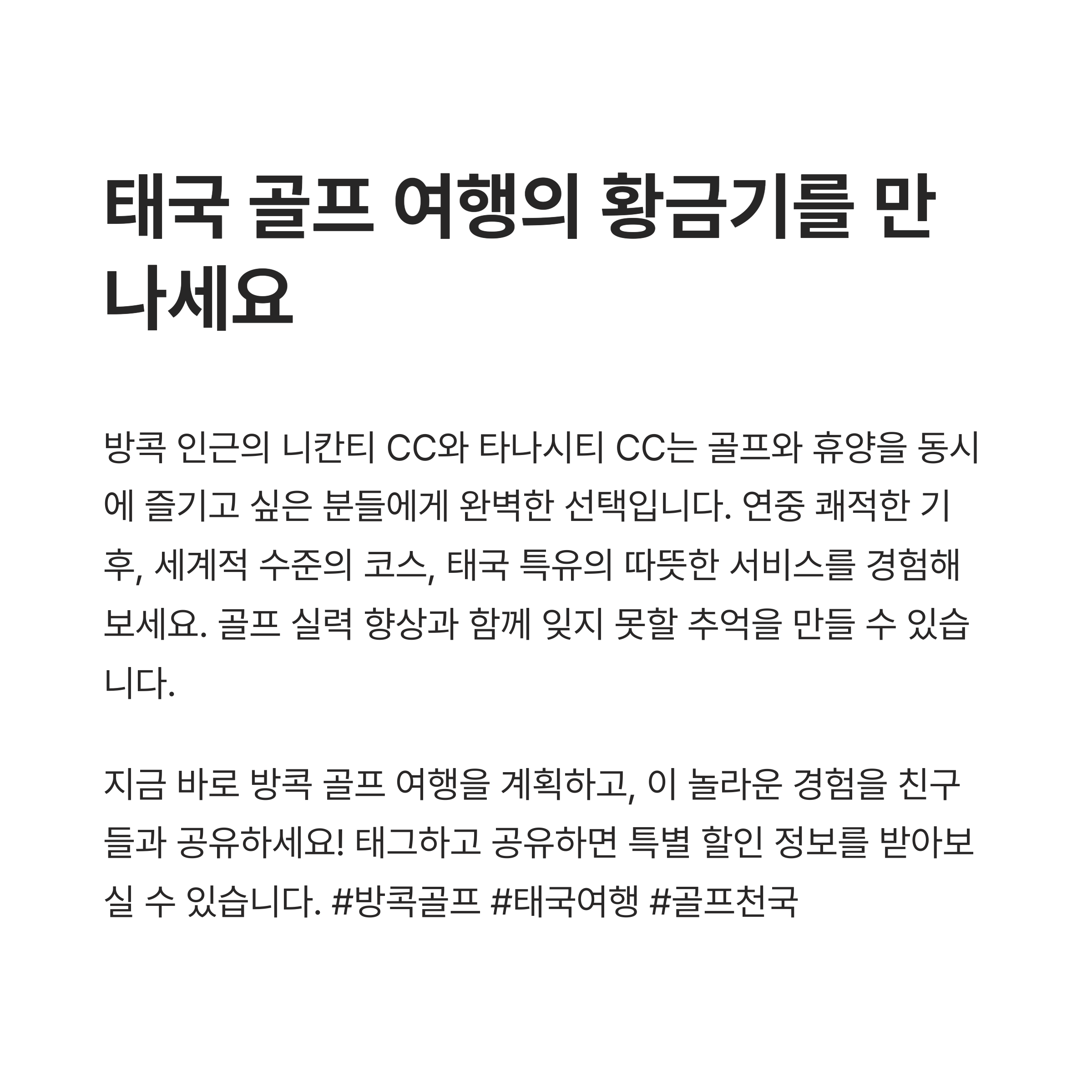 만약 방콕에서 골프 여행을 계획하신다면, 니칸티CC와 타나시티CC는 단순한 골프장이 아니라 특별한 경험을 제공합니다.