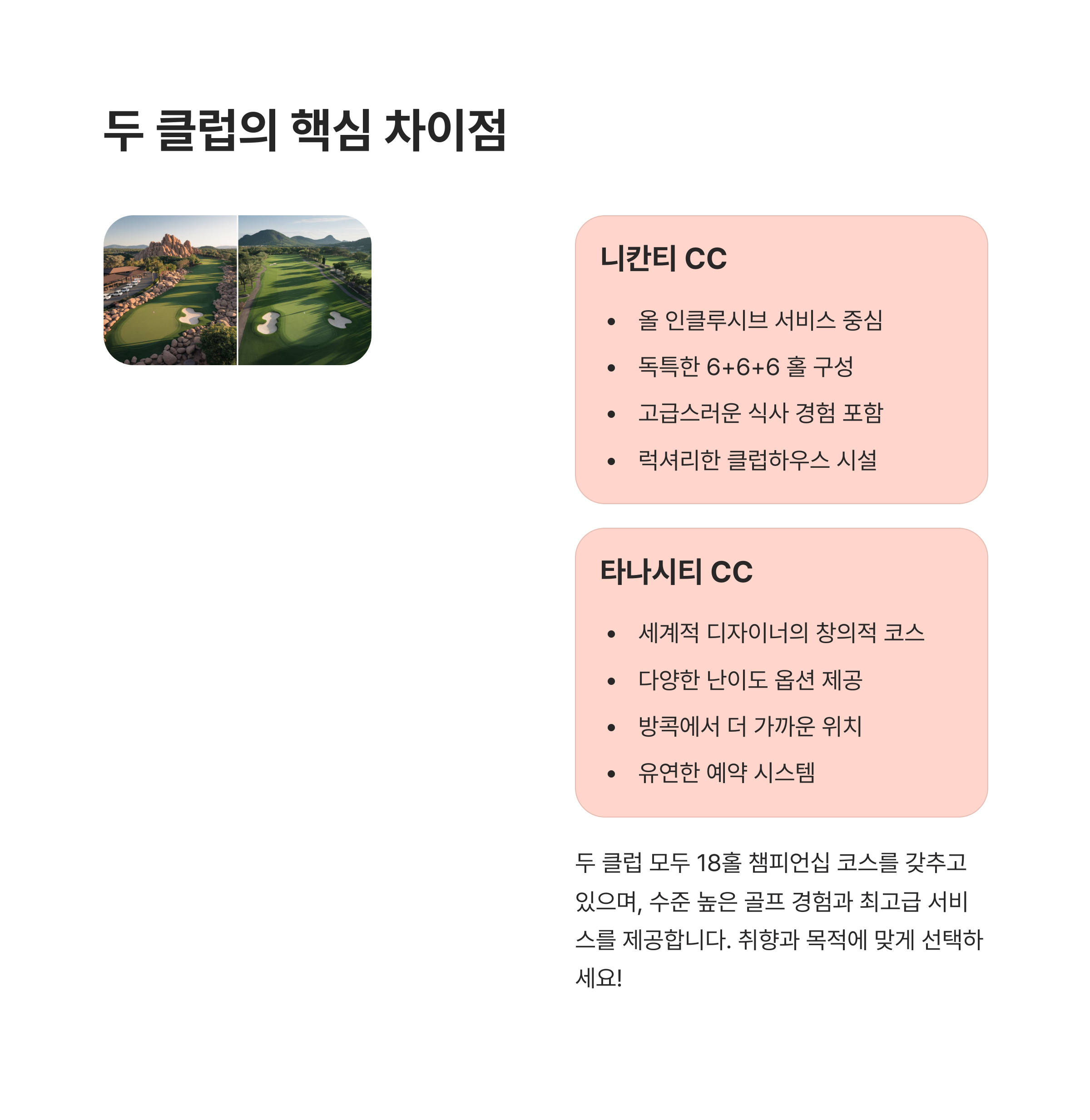 만약 방콕에서 골프 여행을 계획하신다면, 니칸티CC와 타나시티CC는 단순한 골프장이 아니라 특별한 경험을 제공합니다.