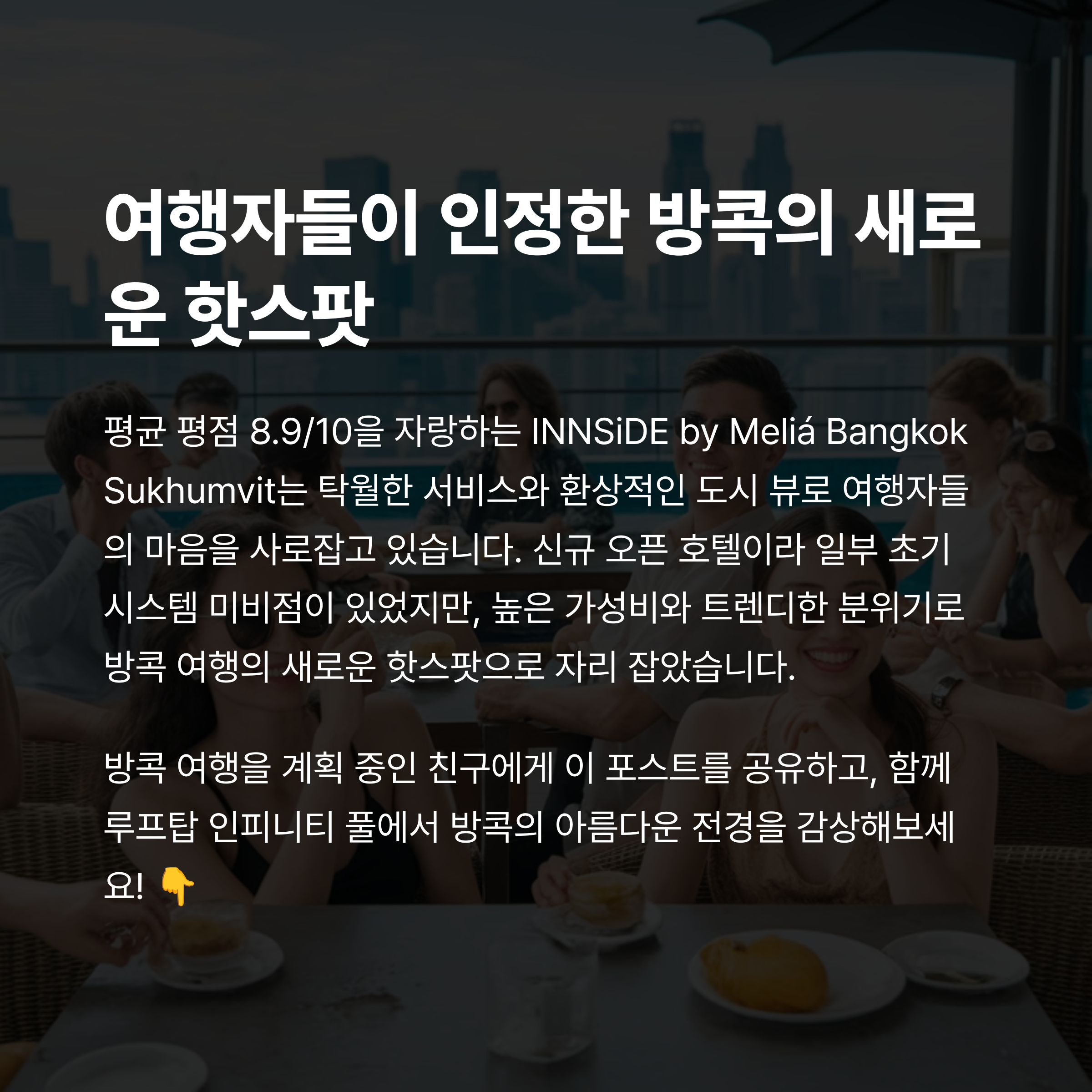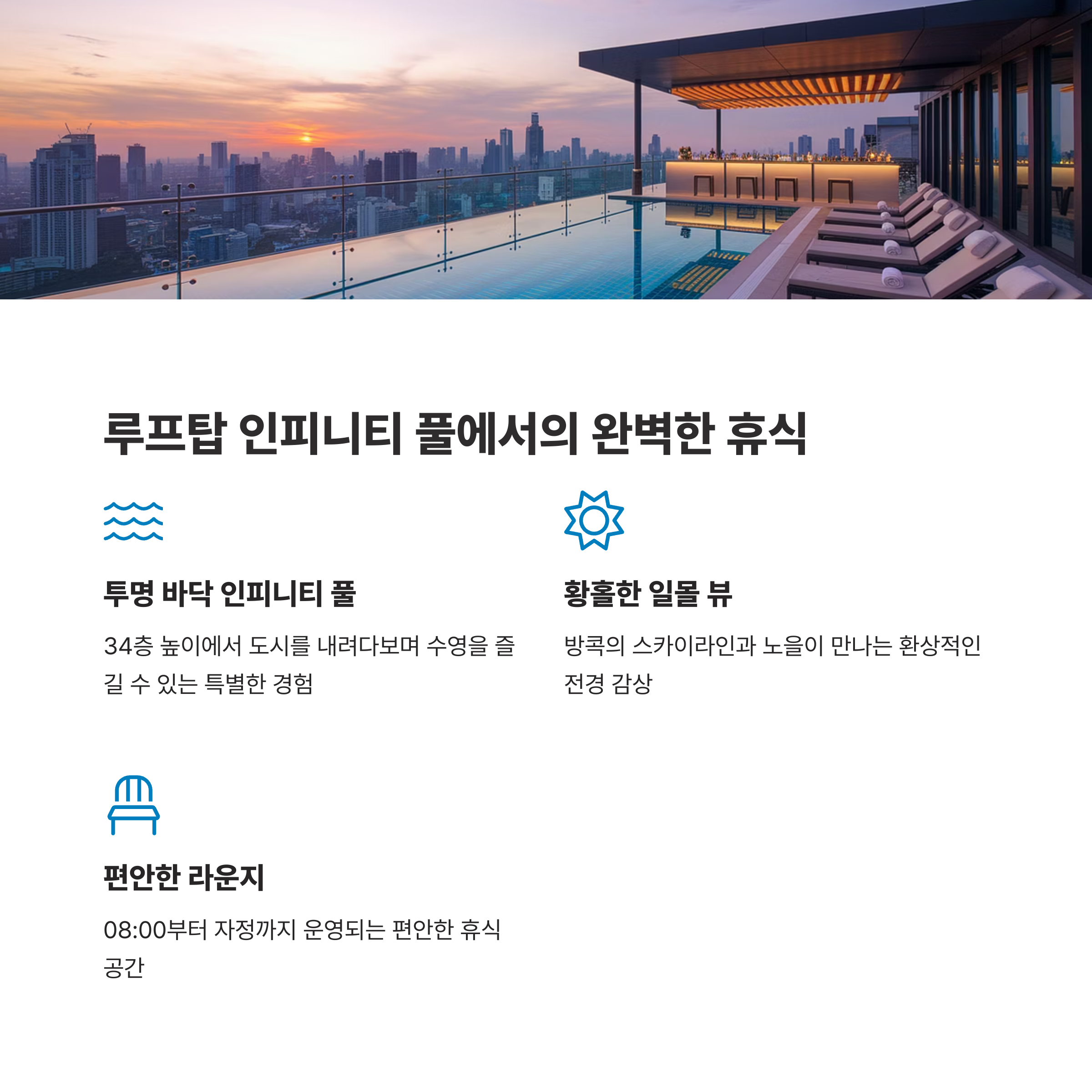 호텔의 루프탑 수영장과 야경은 방콕에서의 특별한 추억으로 평가받습니다.