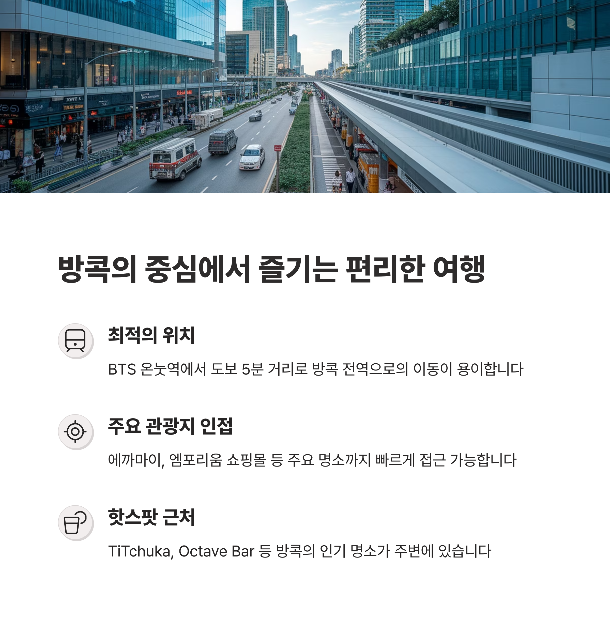 온눗역 근처에 위치하여 이동이 편리하며, 도심 속에서도 럭셔리하게 즐길 수 있는 공간으로 잘 알려져 있습니다.