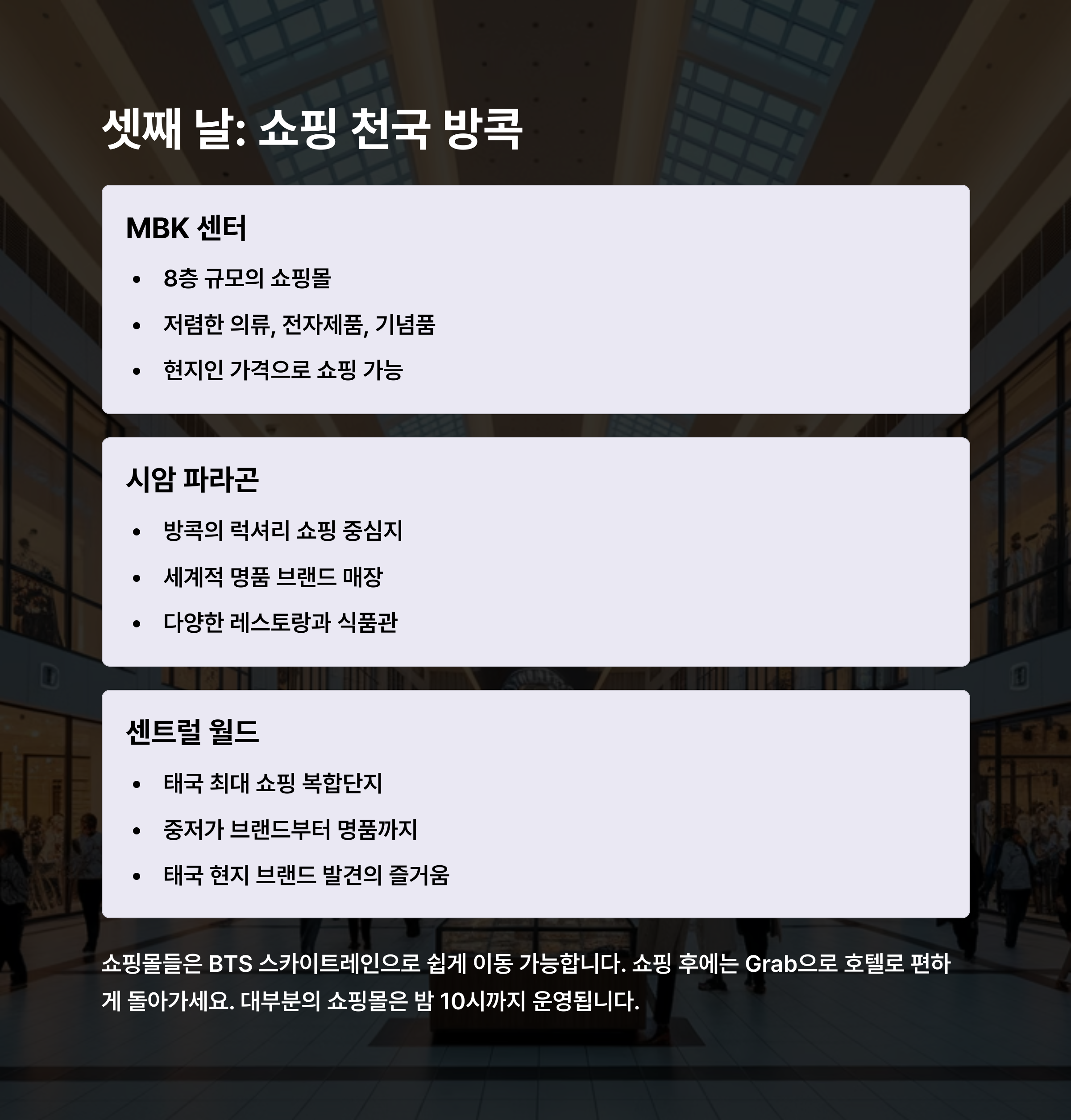 셋째 날 쇼핑의 메카인 시암 파라곤과 센트럴 월드 방문은 필수! 값비싼 물건부터 독특한 기념품까지 모두 만날 수 있습니다.