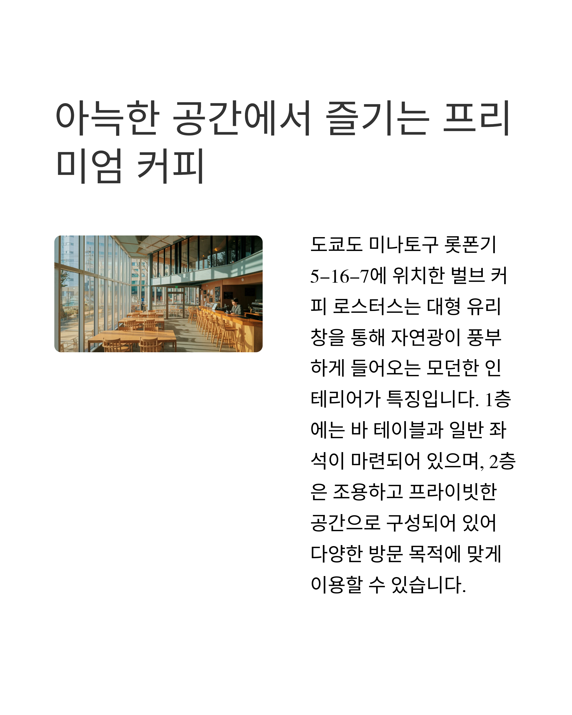 오늘은 도쿄의 인기 카페인 벌브 커피 롯폰기점을 소개하려 합니다.