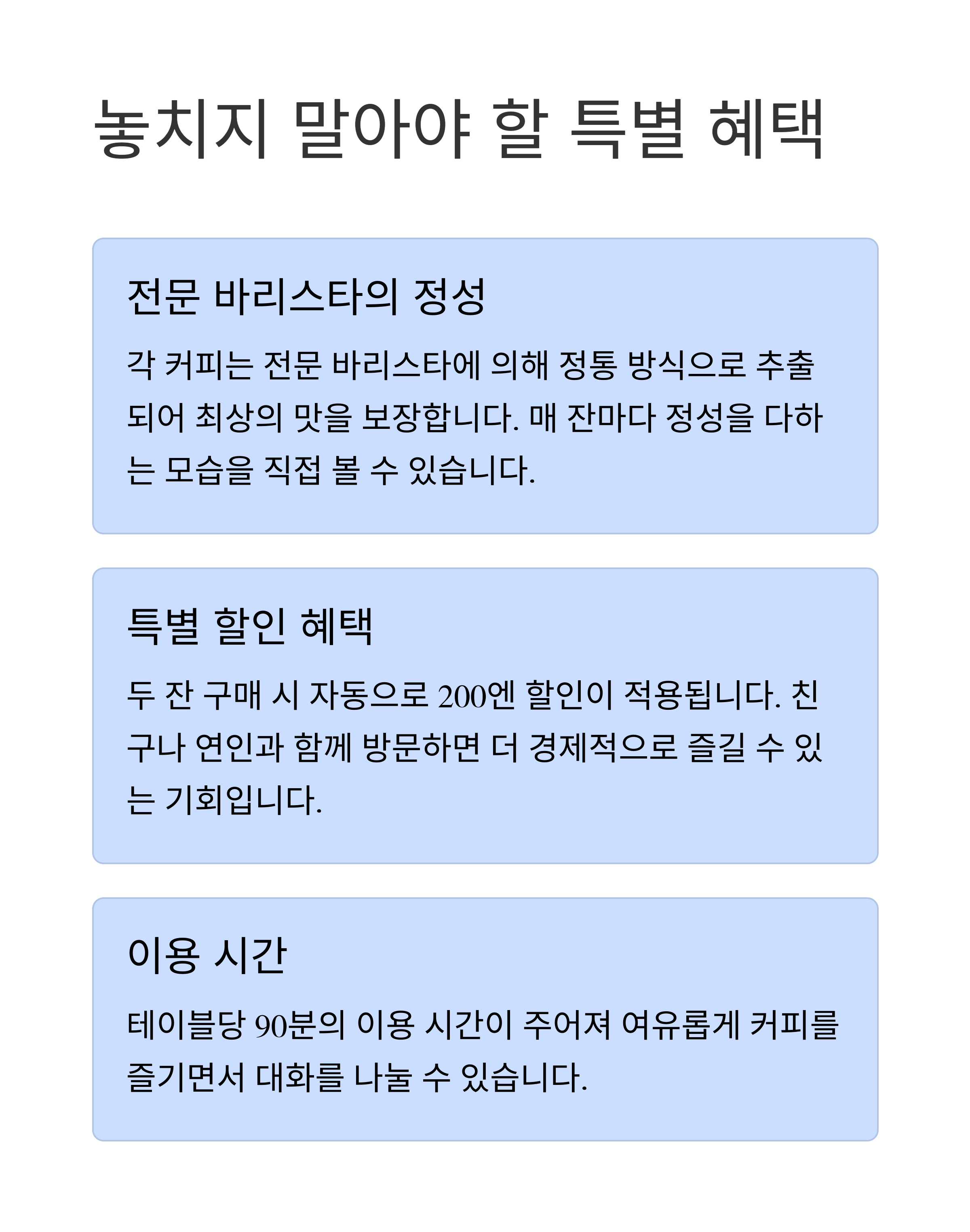 또한 시간 제한 정책은 카페 이용의 공정성을 유지하며 쾌적한 환경을 조성합니다.