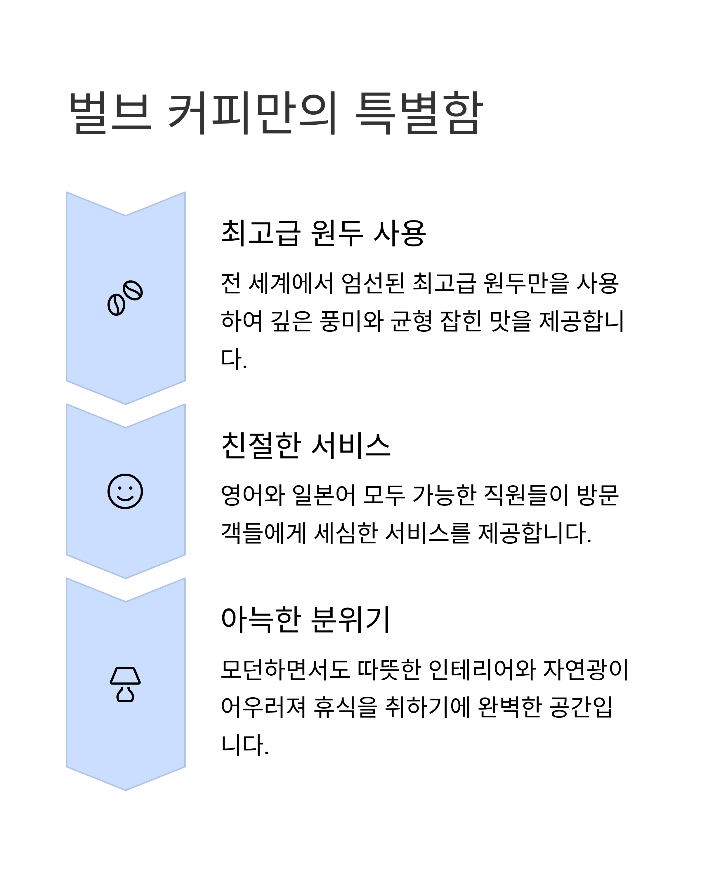 벌브 커피에서는 매일 신선한 원두만 사용하며, 손님의 주문에 맞게 최적화된 추출 방법으로 커피를 제공합니다.