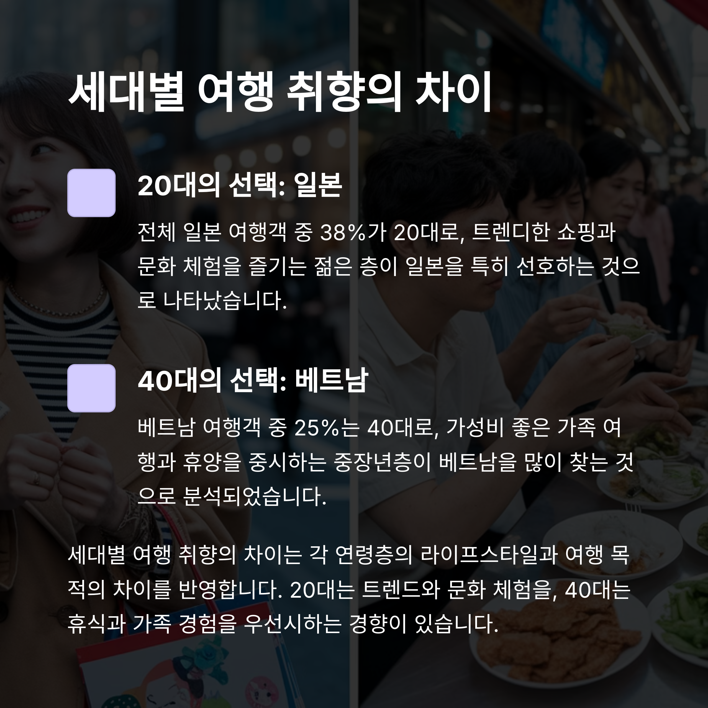 연령별 데이터 분석에서도 뜨거운 반응이 나타났는데, 20대는 일본, 40대는 베트남을 주로 선택하며 각 세대의 선호가 뚜렷하게 드러났습니다.