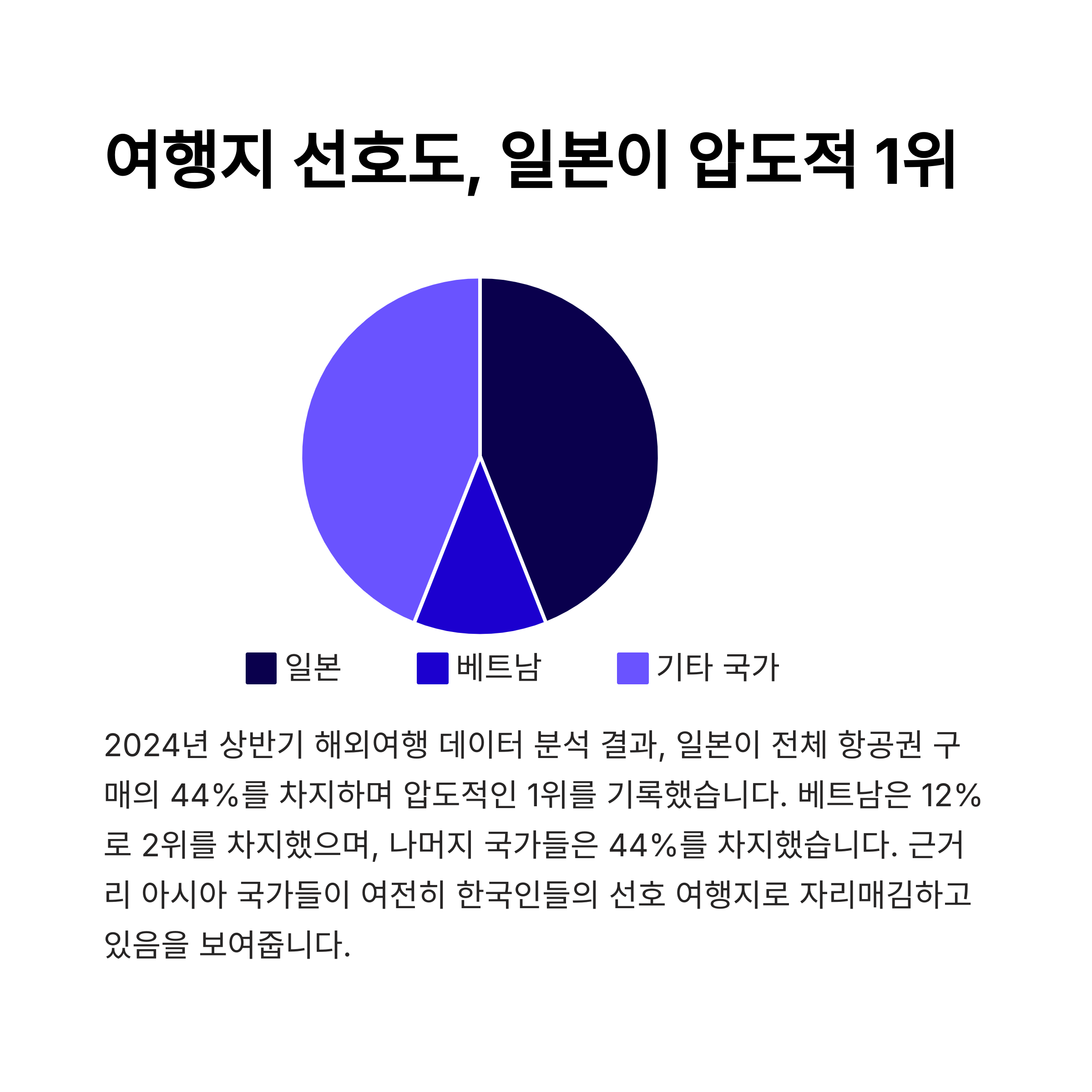 2024년 상반기를 기준으로 일본은 전체 해외 항공권 예약 중 약 44%를 차지하며 여전히 가장 사랑받는 해외 여행지로 자리 잡았습니다.