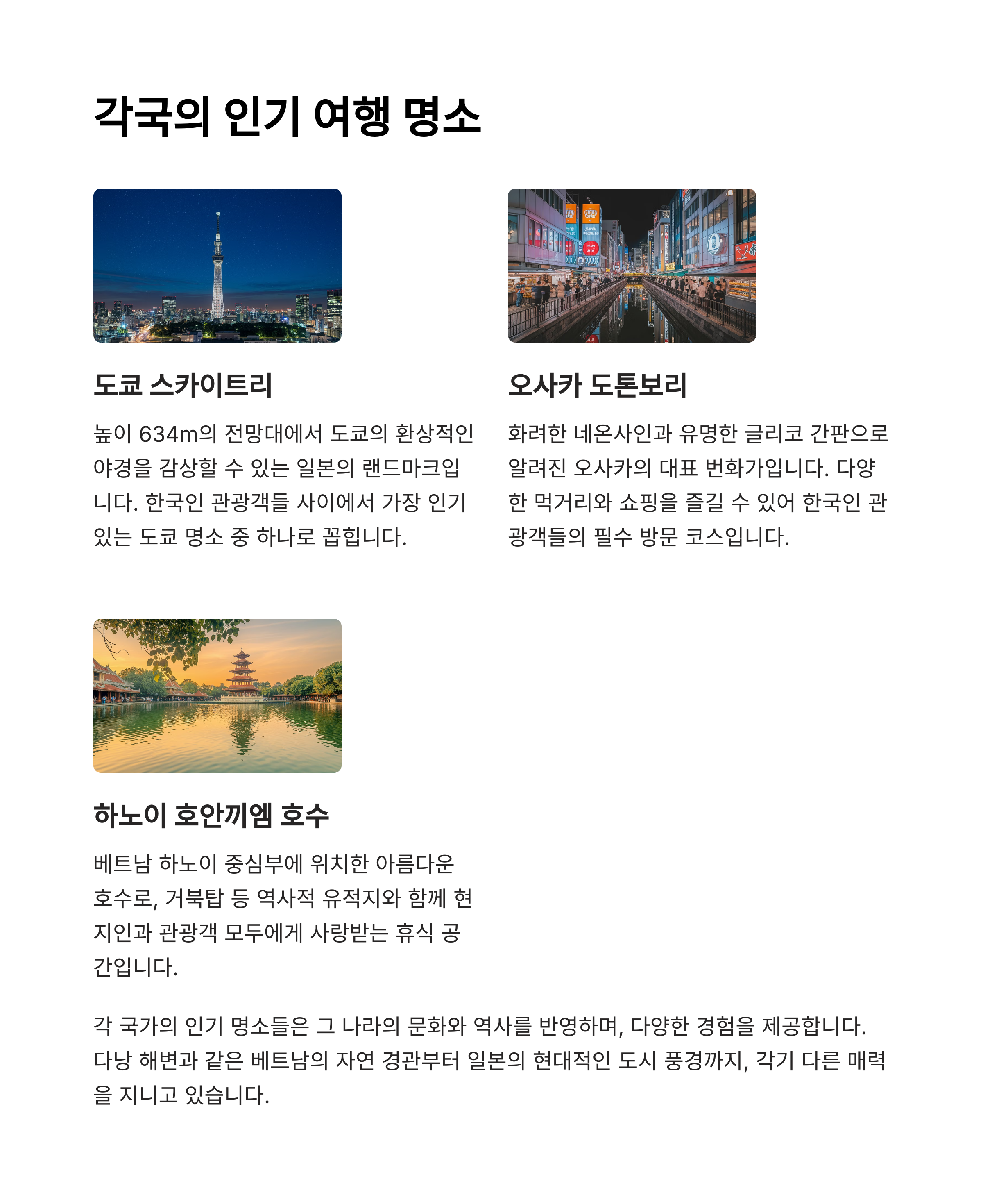 반면, 일본은 역사와 현대 문화가 조화된 관광지를 중심으로 문화적 체험을 제공합니다.