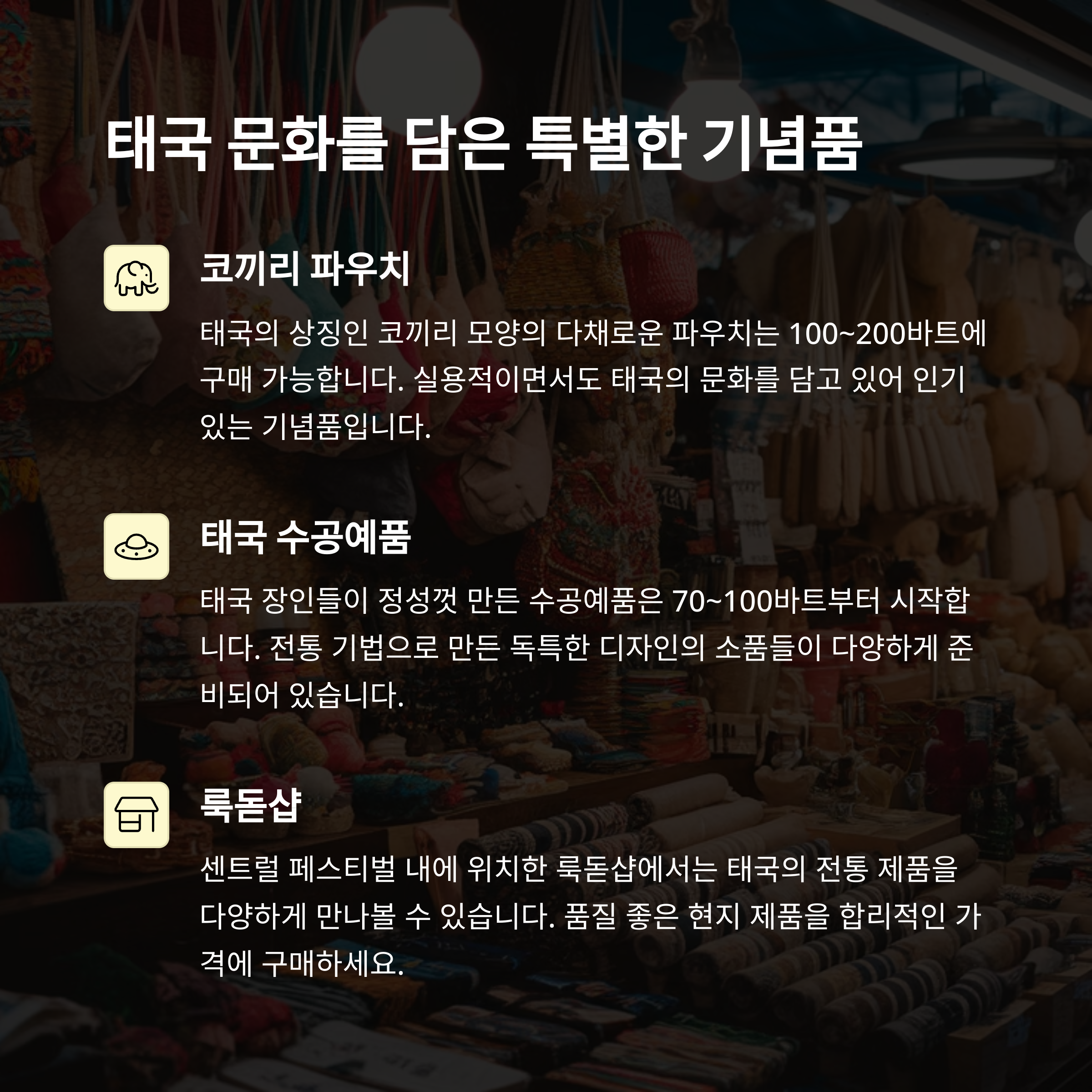 특히, 코끼리 파우치와 태국산 꿀은 전통과 실용성 둘 다 만족시켜줄 기념품으로 추천드립니다.
