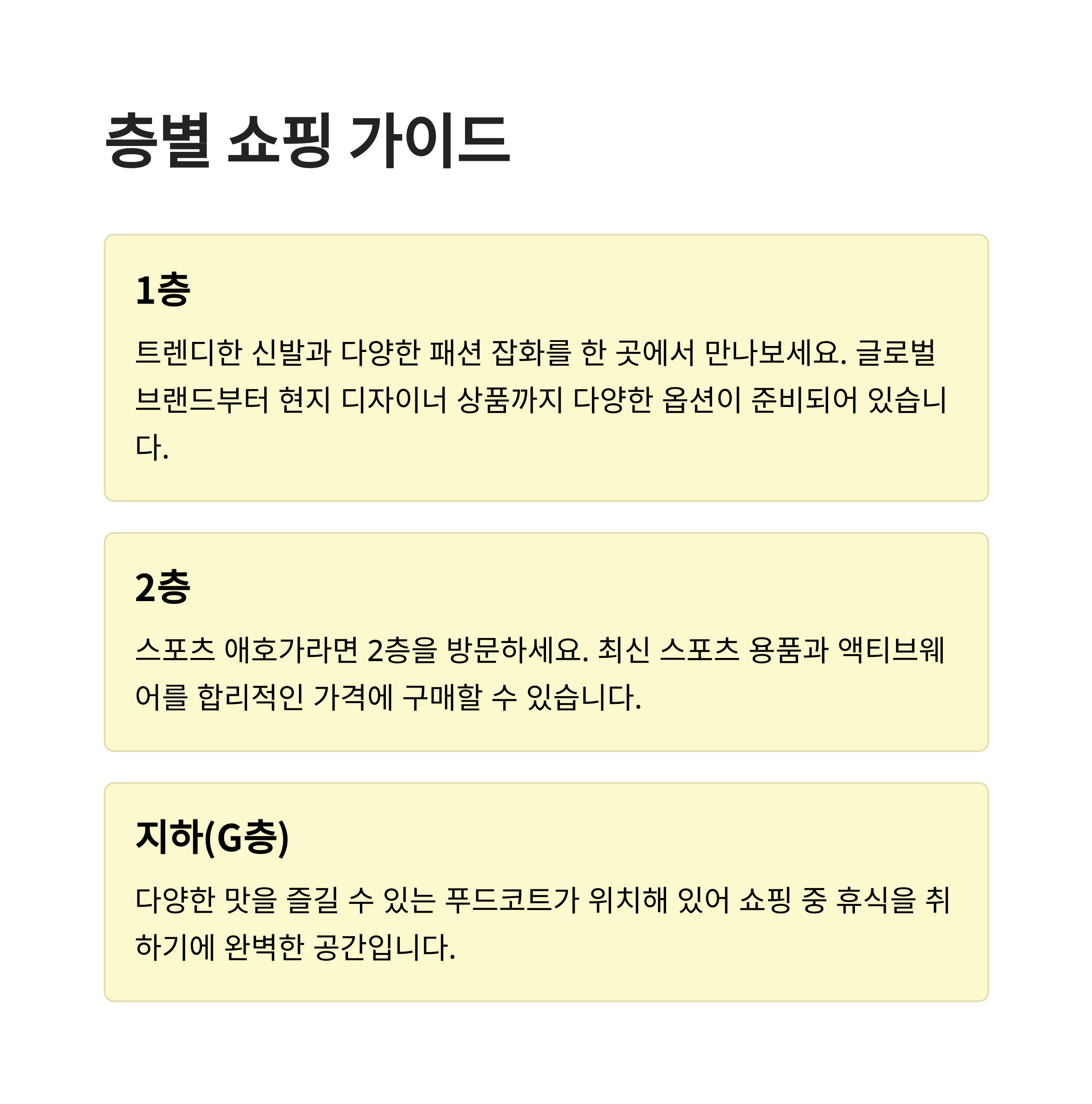 가장 추천하는 층은 2층 스포츠용품 매장과 G층 푸드코트로, 방문 전 동선을 미리 계획하시는 것을 권장합니다.