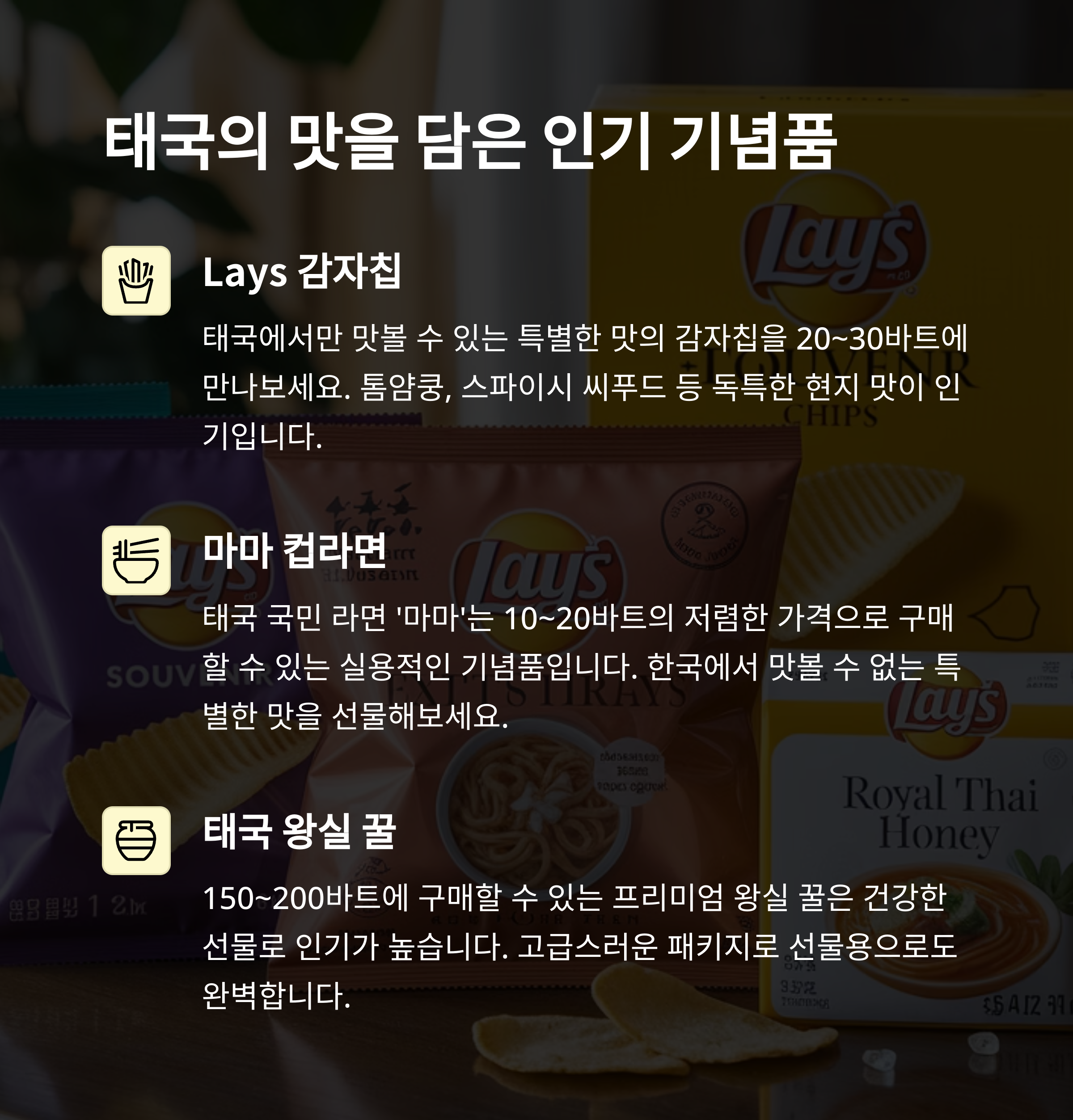 기념품으로는 코끼리 파우치, 태국 과자 등이 인기가 많습니다.