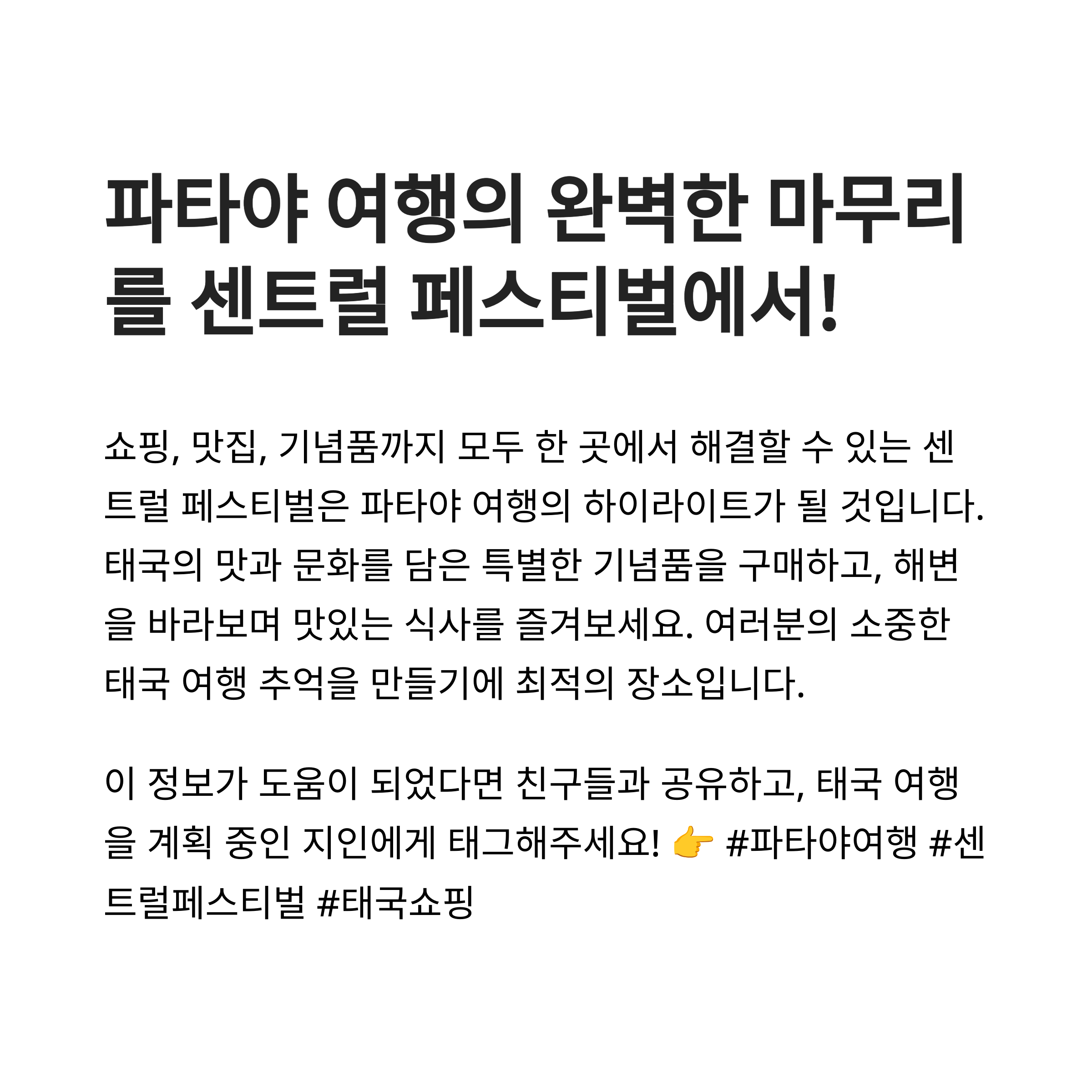 오늘은 태국의 명소 중 하나인 센트럴 페스티벌 파타야에서 쇼핑할 수 있는 필수 아이템과 기념품을 소개해 드릴게요.