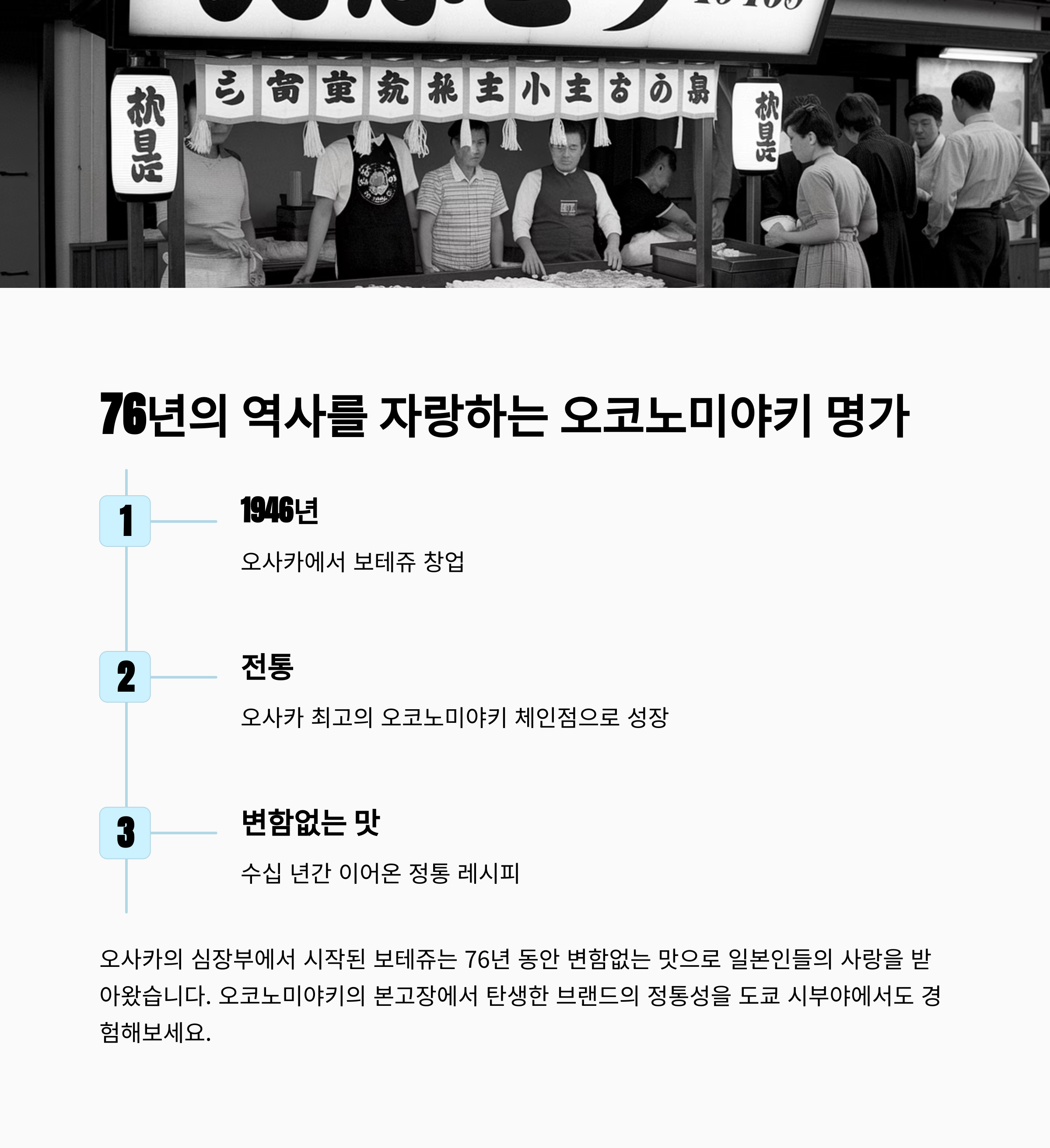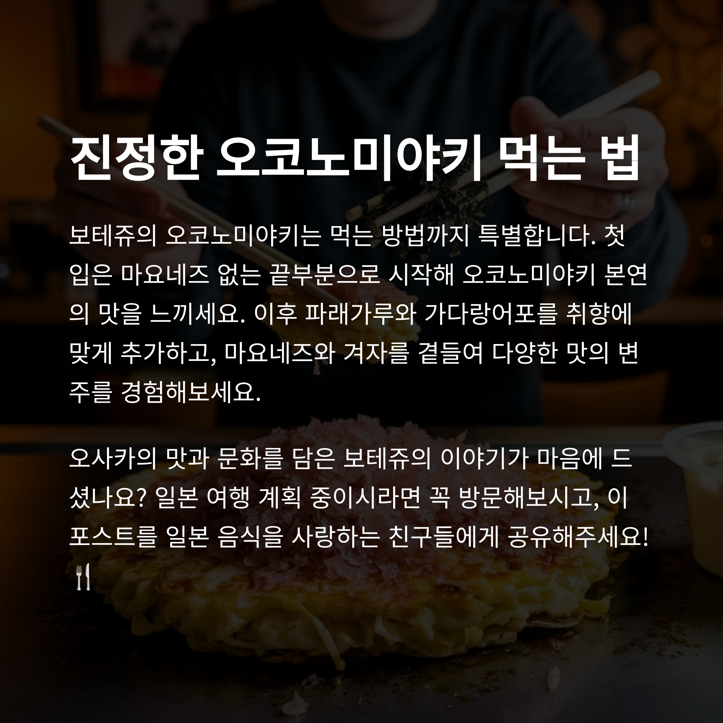 보테쥬는 오코노미야키의 창시자로서 긴 역사와 전통을 자랑합니다.