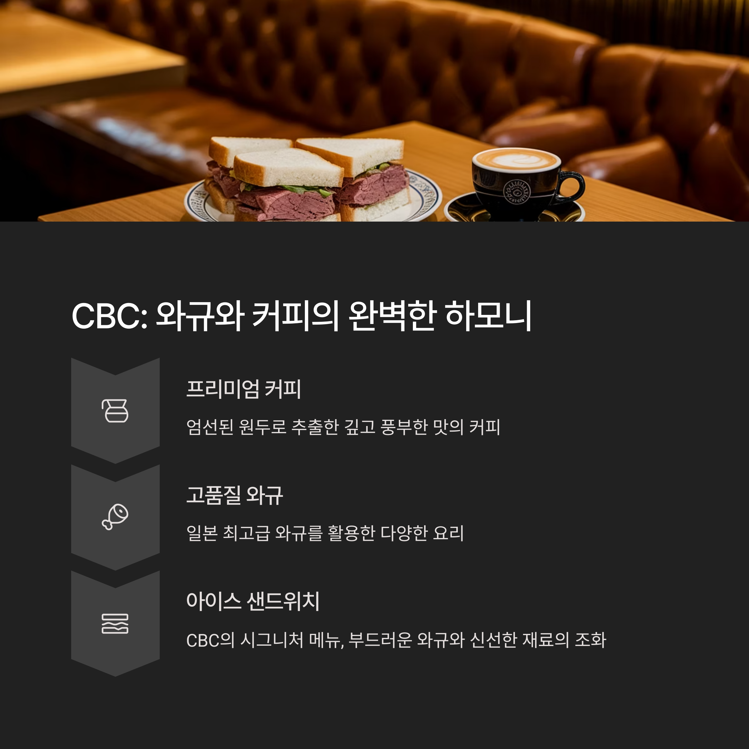 CBC coffee & beef carnevale에서는 와규와 커피 조합이라는 독특한 테마를 즐길 수 있으며 특별한 아이스 샌드위치 디저트가 인기입니다.