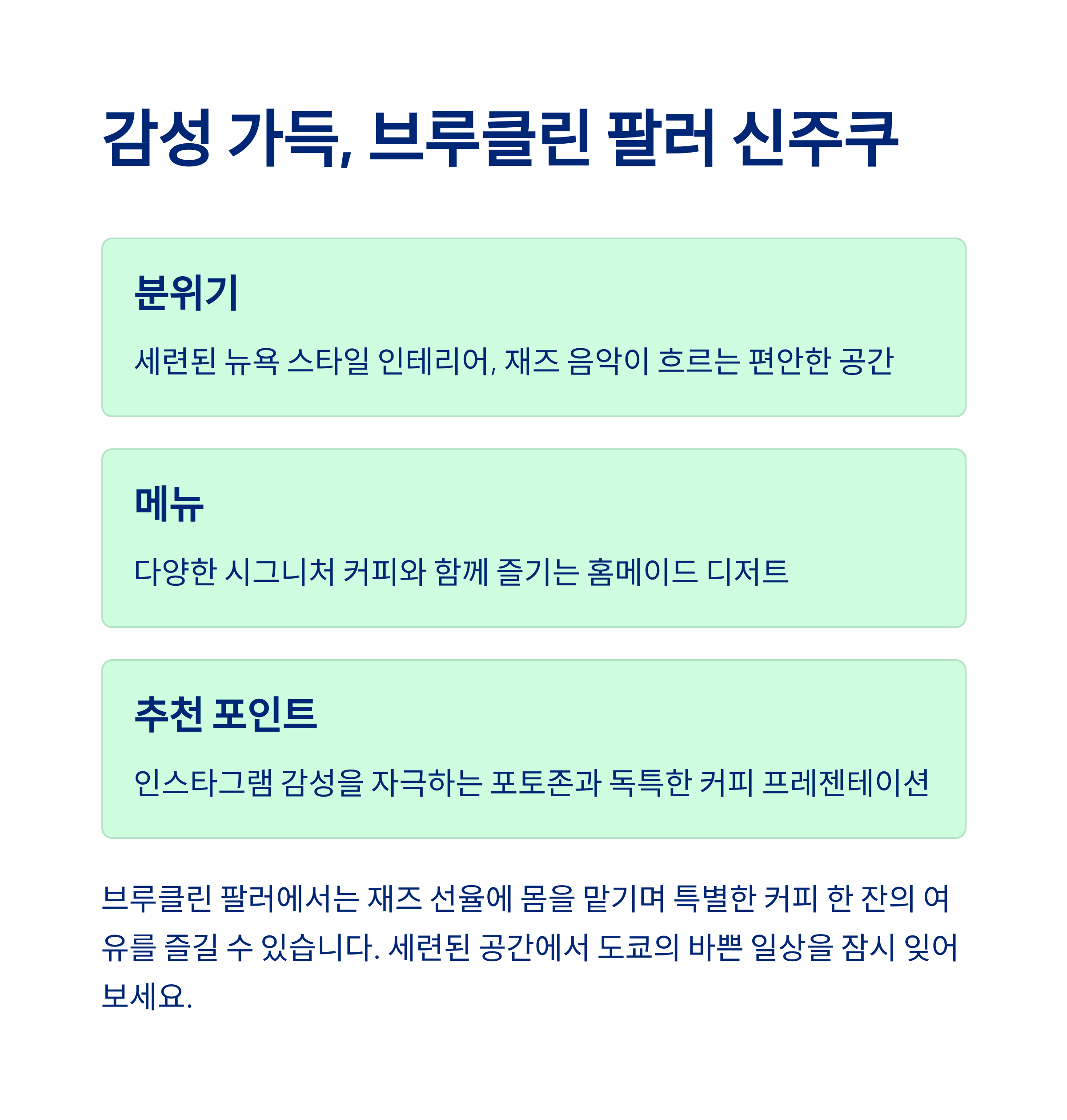 반면 브루클린 팔러는 분위기와 디저트를 중시하는 방문객들에게 최적화된 장소로 유명합니다.