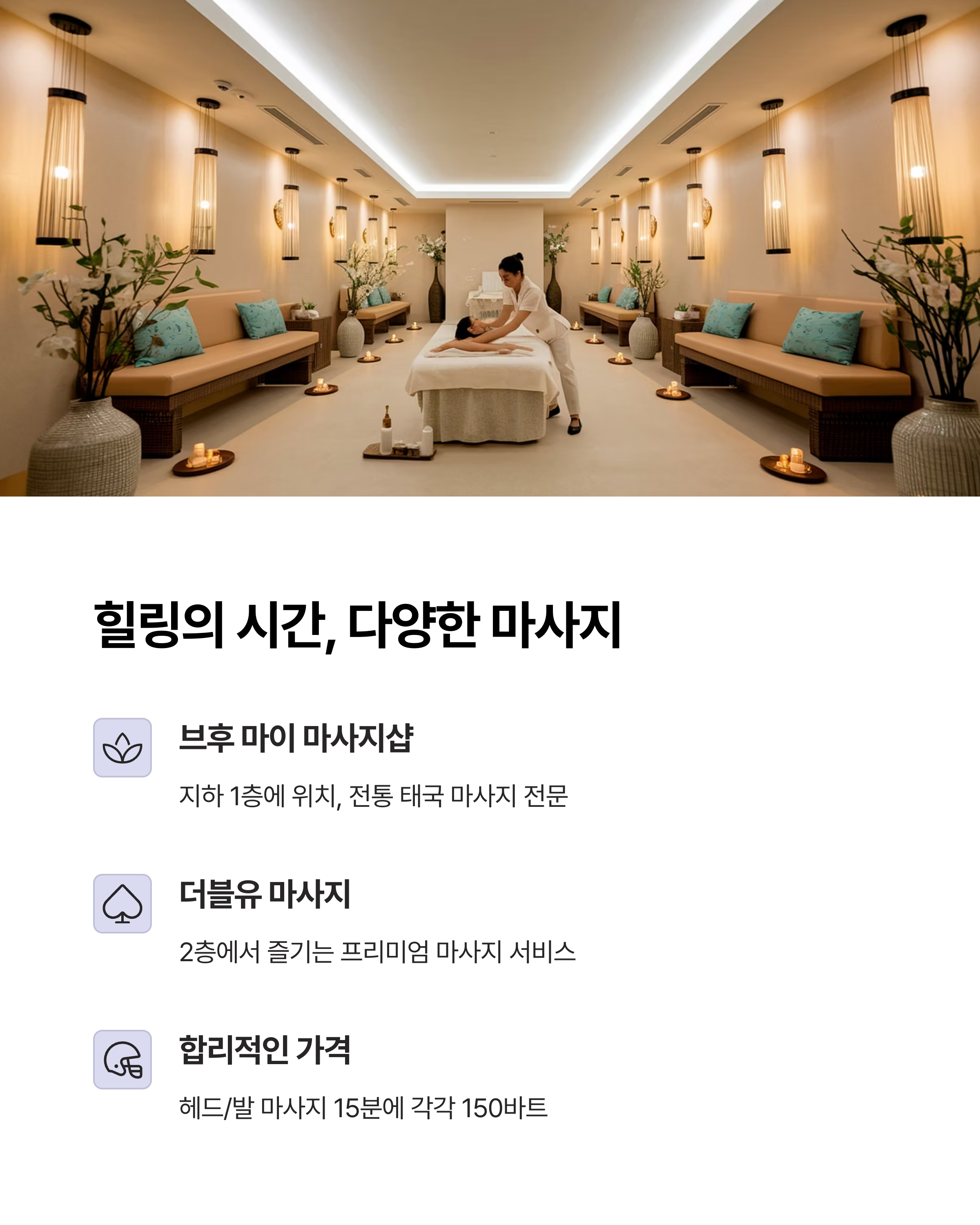 150바트로 합리적이며, 헤드 마사지와 발 마사지가 대표적입니다.
