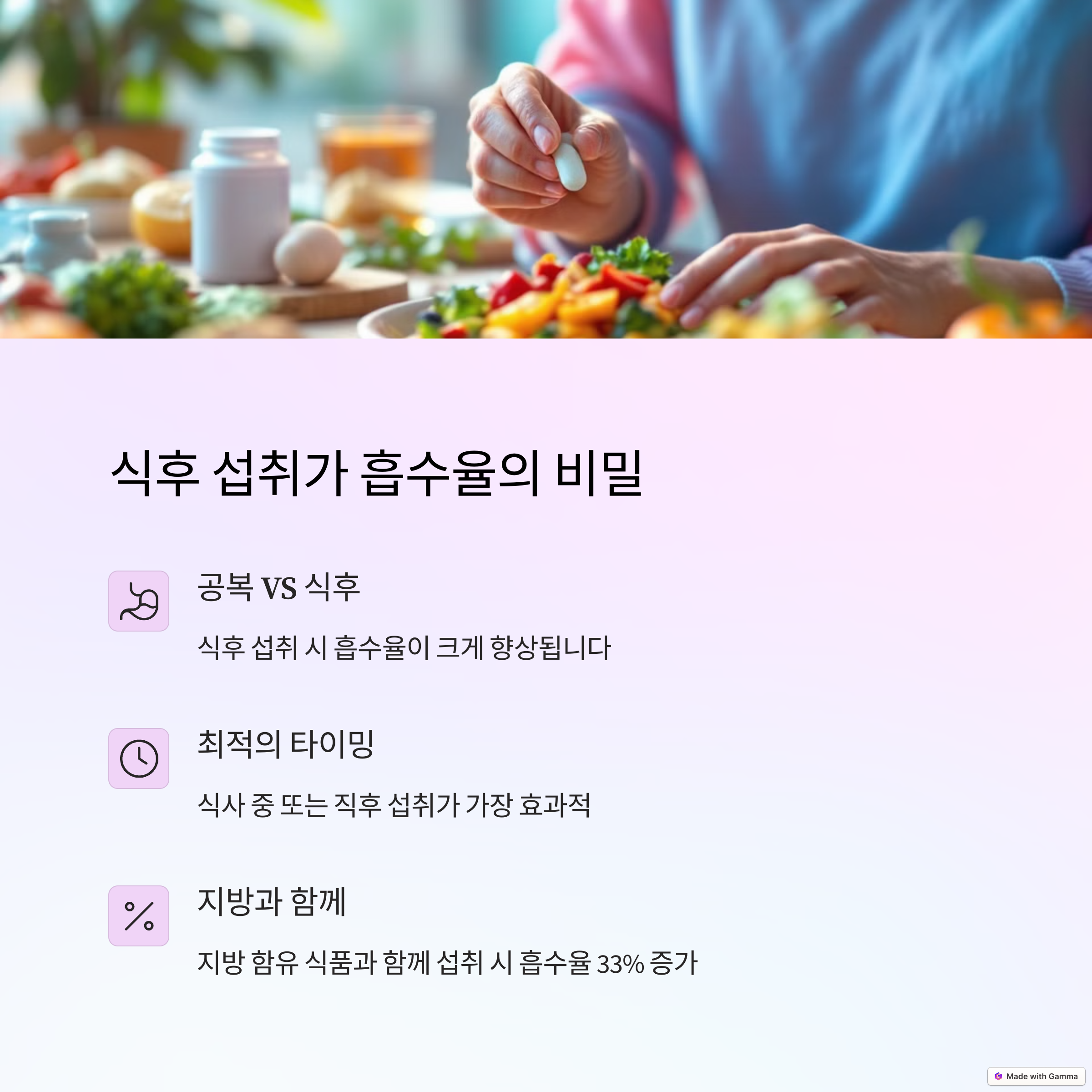 • 식사 후 섭취 시 흡수율 증가 (특히 지방 포함 식사)