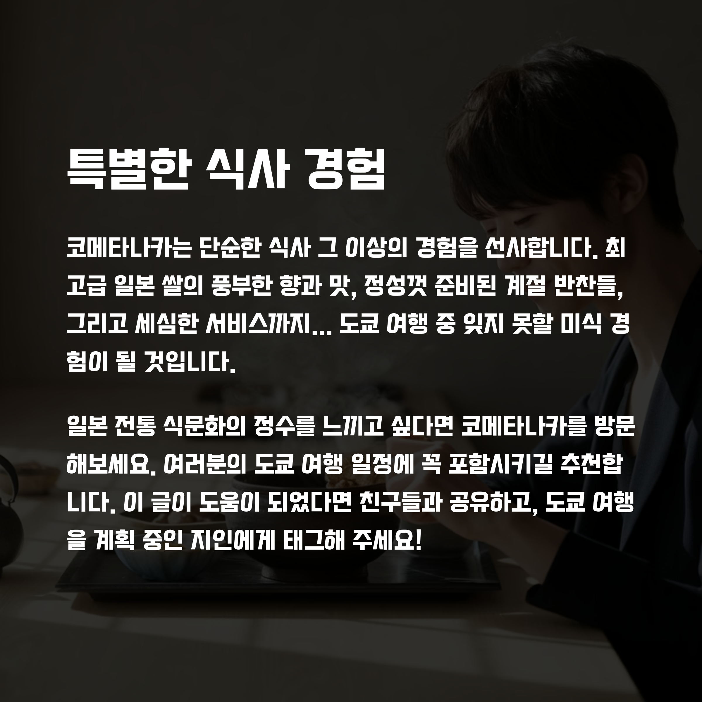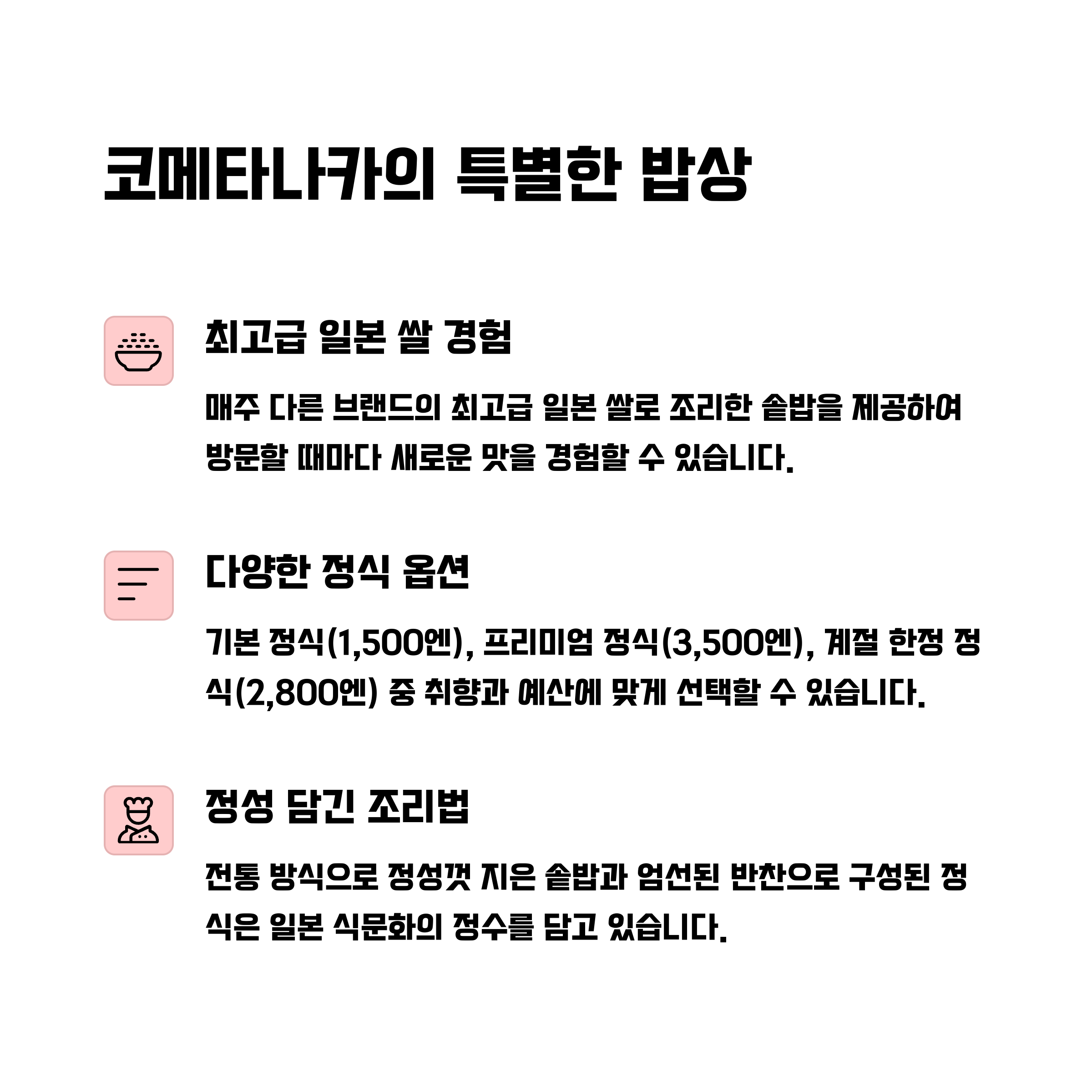 코메타나카에서 정갈한 일본 정식의 정수를 제대로 체험해 보시길 권장드립니다.