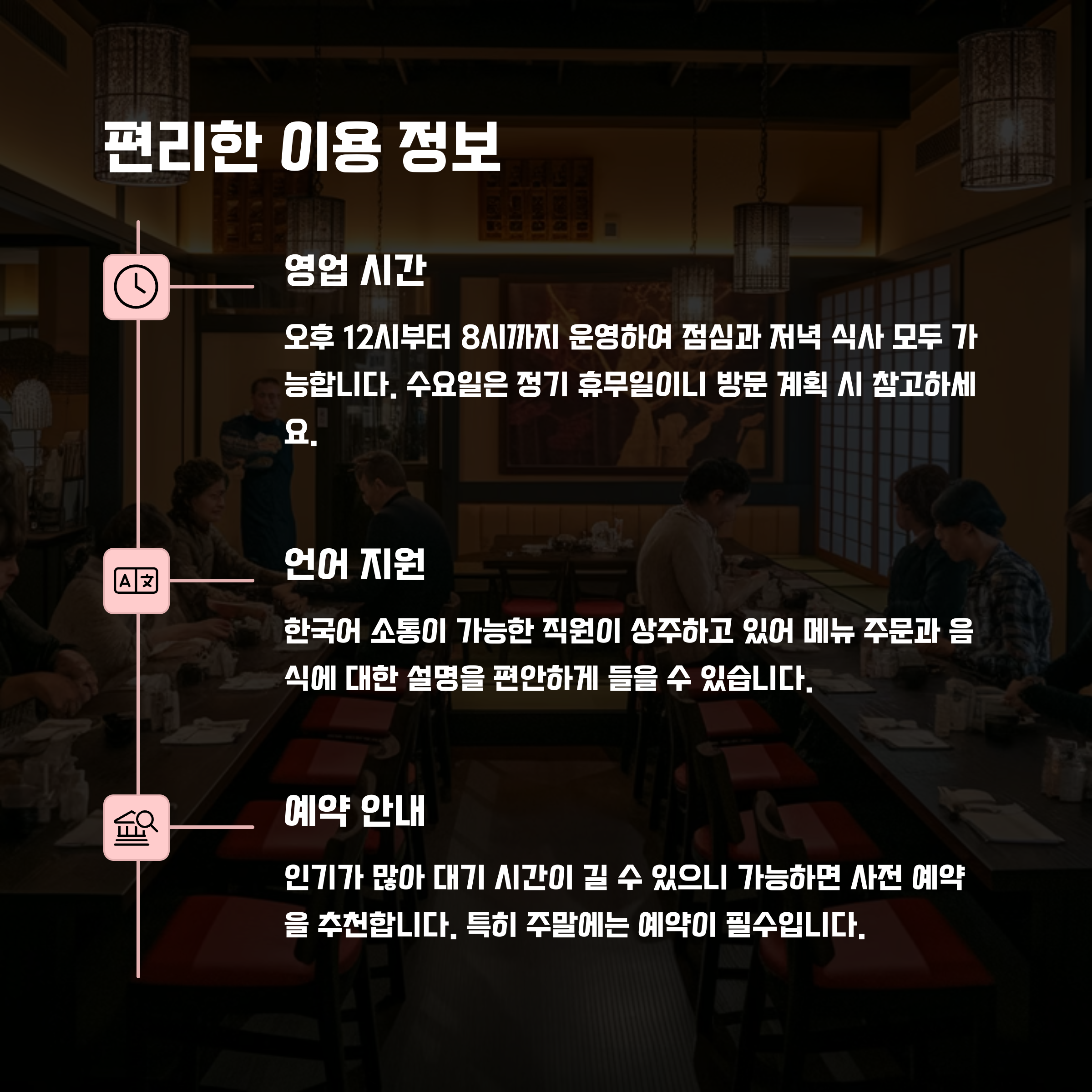 | 코메타나카는 소규모 좌석 공간과 인기로 예약이 권장됩니다. 런치 타임에는 특히 대기 시간이 발생하기 쉽습니다. 평일보다 주말에 예약 빈도가 더 높은 편입니다. 예약 없이 방문해도 자리가 있으면 이용 가능하지만 확률이 낮습니다. 사전 예약으로 대기 시간을 줄이고 편리하게 이용할 수 있습니다. |