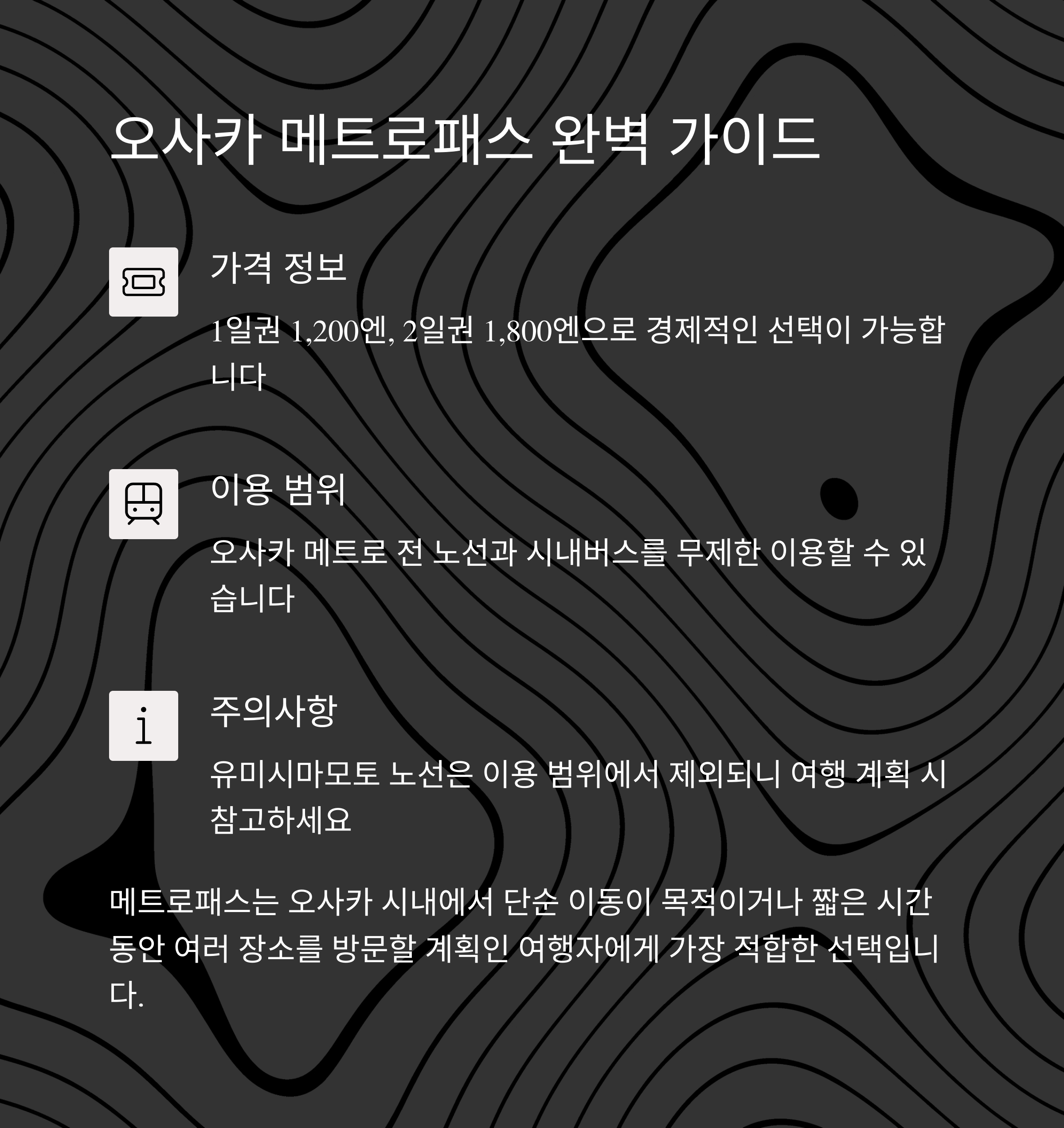 메트로패스는 오로지 오사카 메트로와 시내버스만 이용 가능하며, 관광 목적보다는 교통비 절약에 초점이 맞춰져 있습니다.