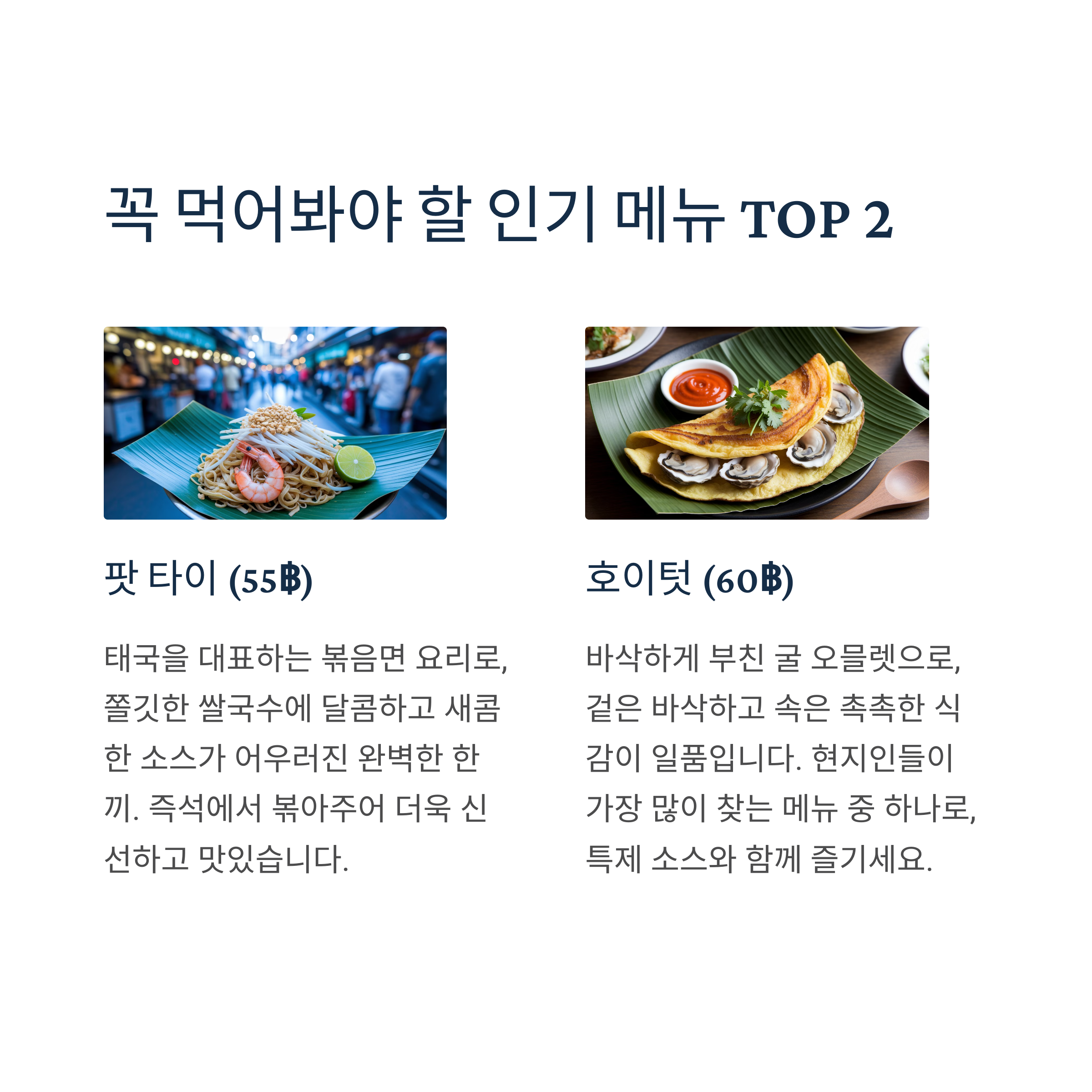 팟 타이, 호이텃(굴전) 같은 태국 전통 음식이 60바트라는 가격으로 맛볼 수 있는 점이 매력적입니다.