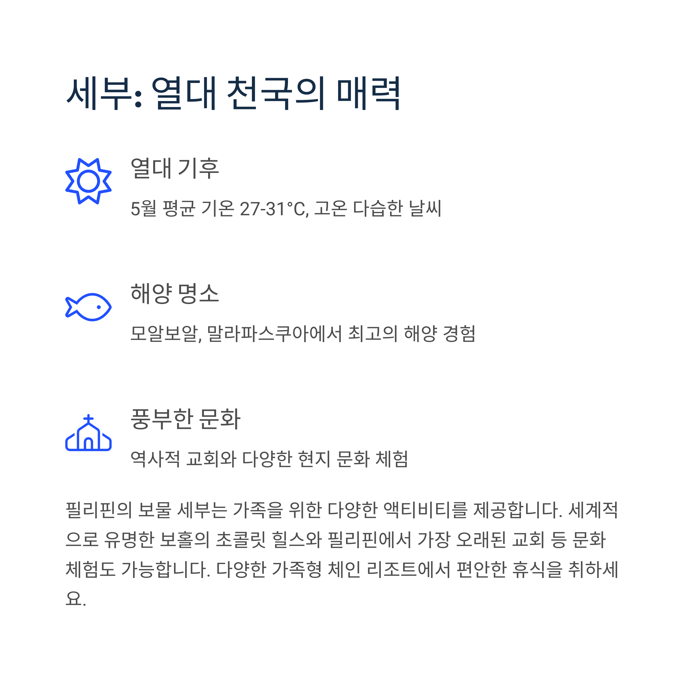 세부는 모알보알 스노클링과 보홀 투어 등 자연 친화적인 활동으로 청소년 및 성인 가족 여행객들에게 인기가 많습니다.