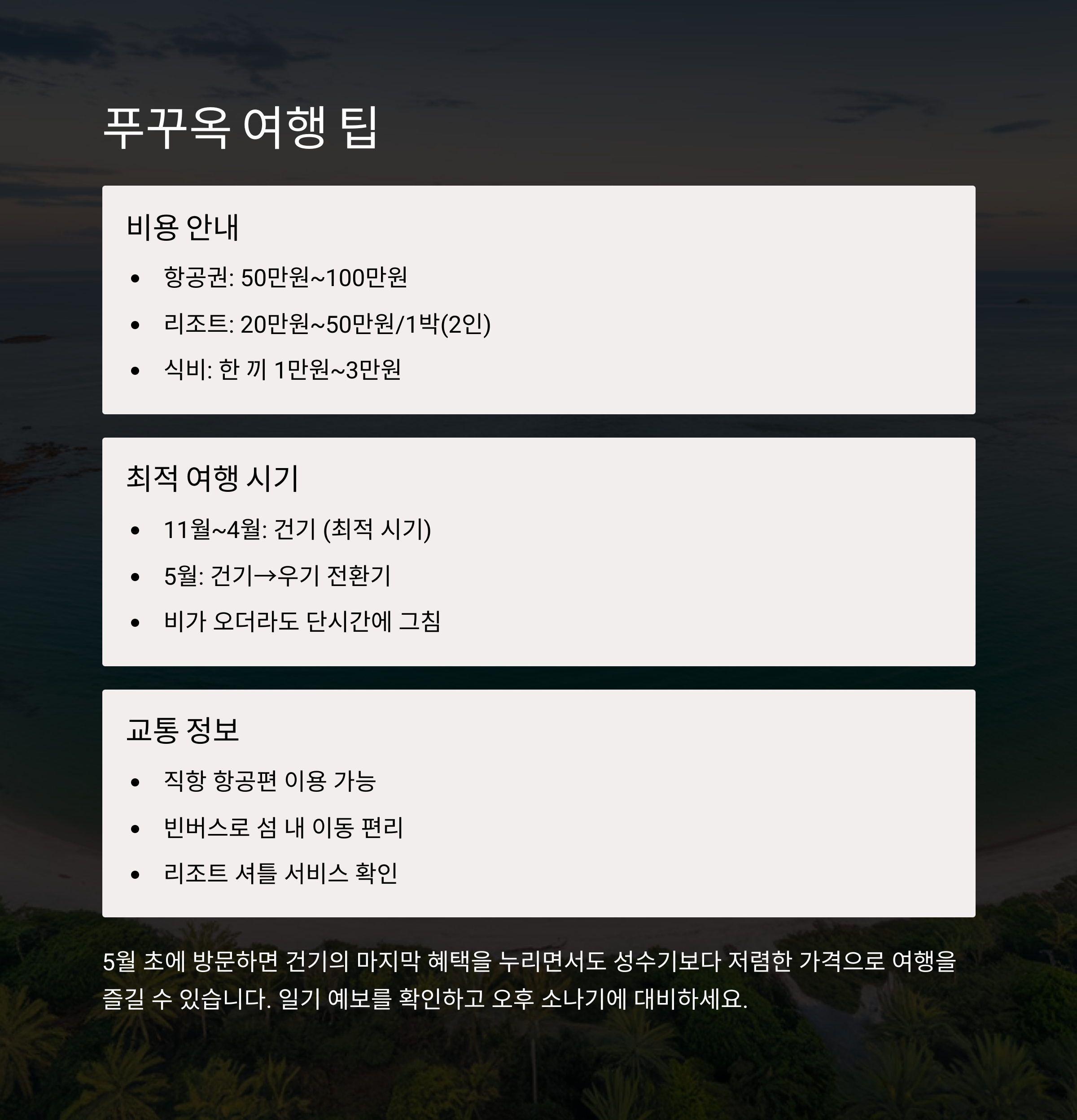 따라서 예산이 제한적일 경우 세부를 선택하고, 여유가 있다면 푸꾸옥의 럭셔리 리조트를 추천합니다.