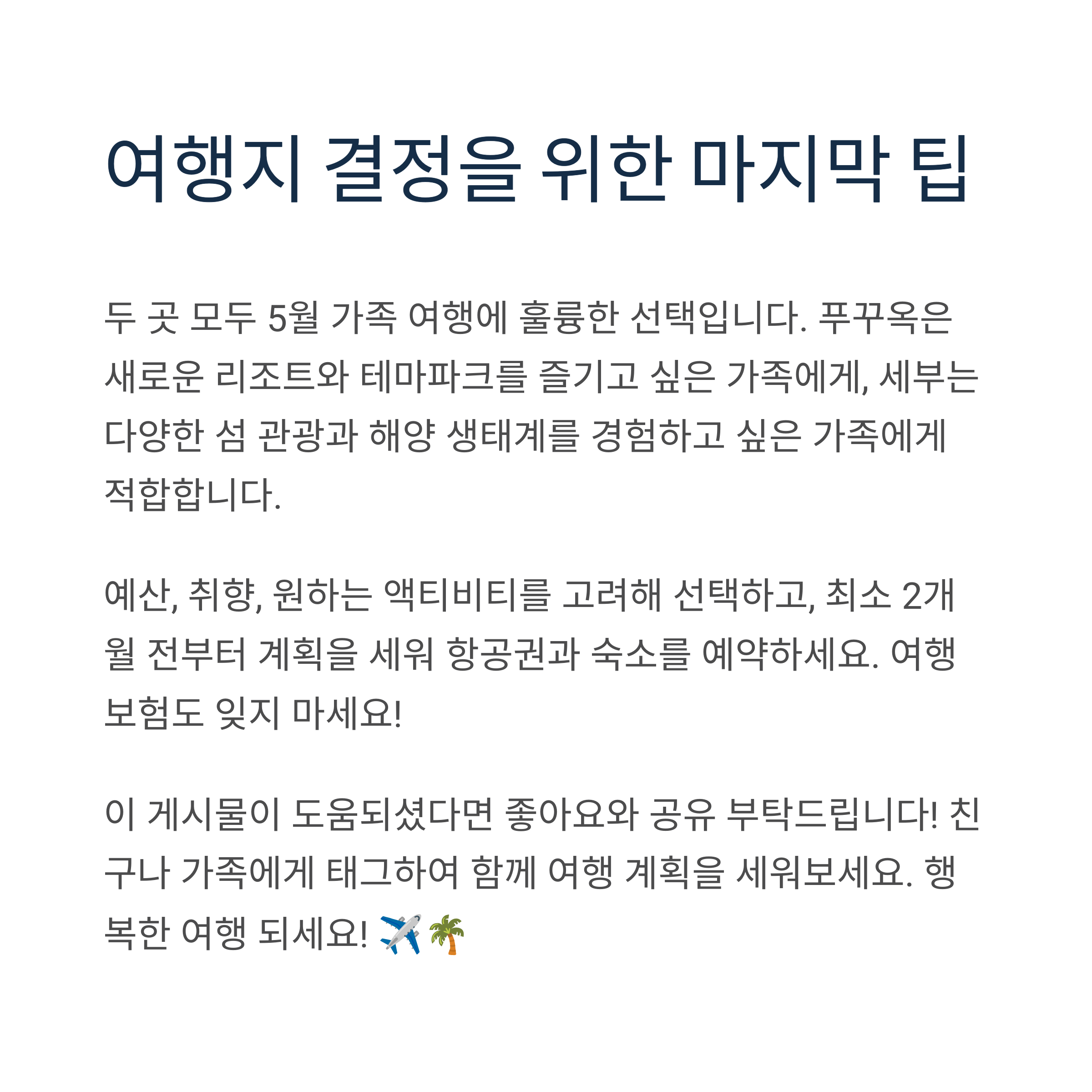 | Q. 가족 여행으로 푸꾸옥과 세부 중 어디가 더 적합한가요? |