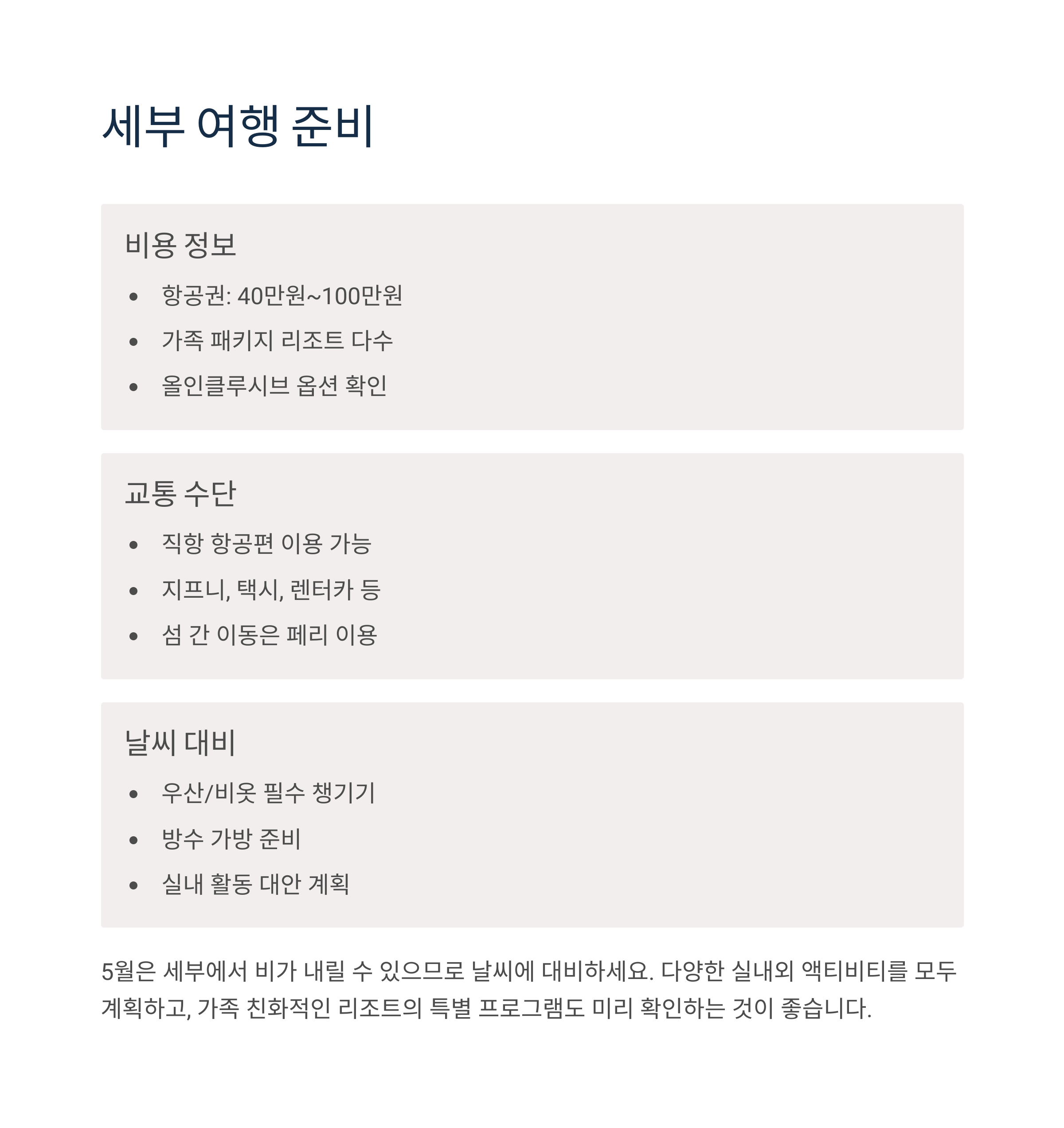반면, 세부는 고온 다습한 상태로, 스콜이나 강한 비가 내릴 가능성이 있어 사전 정보 확인이 중요합니다.