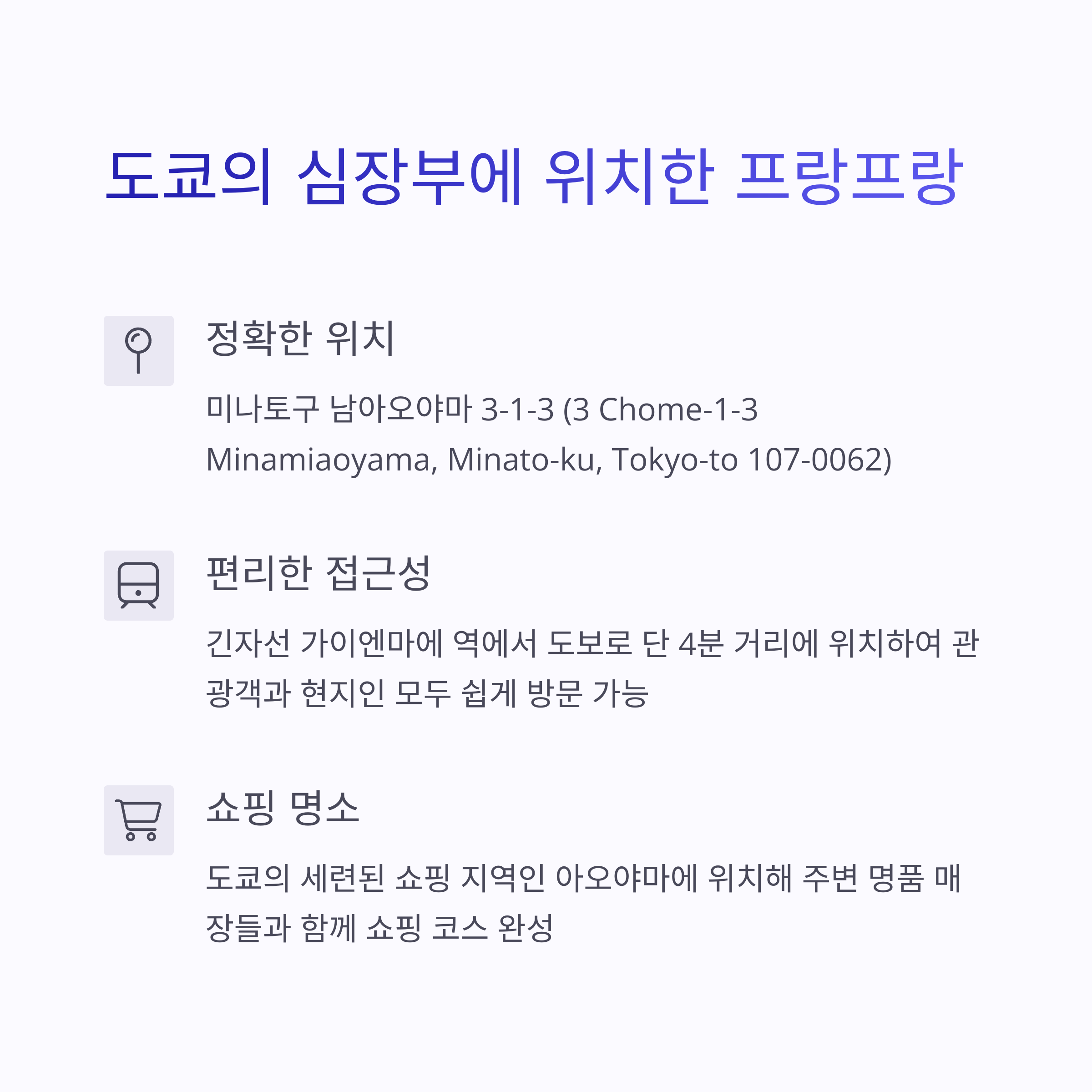 | 주요 위치 정보 | 도쿄 아오야마, 긴자선 Gaienmae 역에서 도보 4분 |