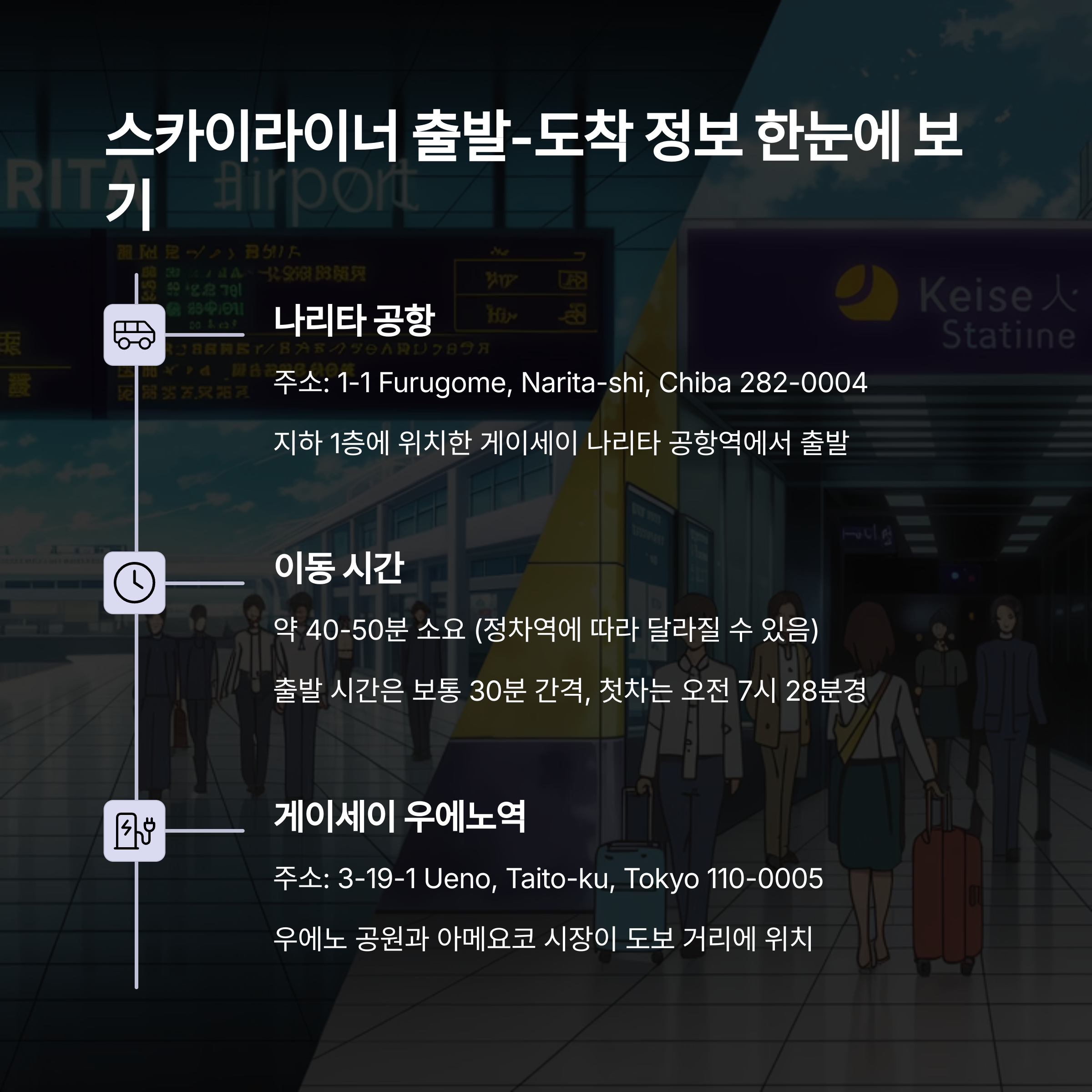 스카이라이너는 약 41분 만에 도쿄 중심부로 도착하며, 시간 절약을 원할 때는 강력 추천됩니다.