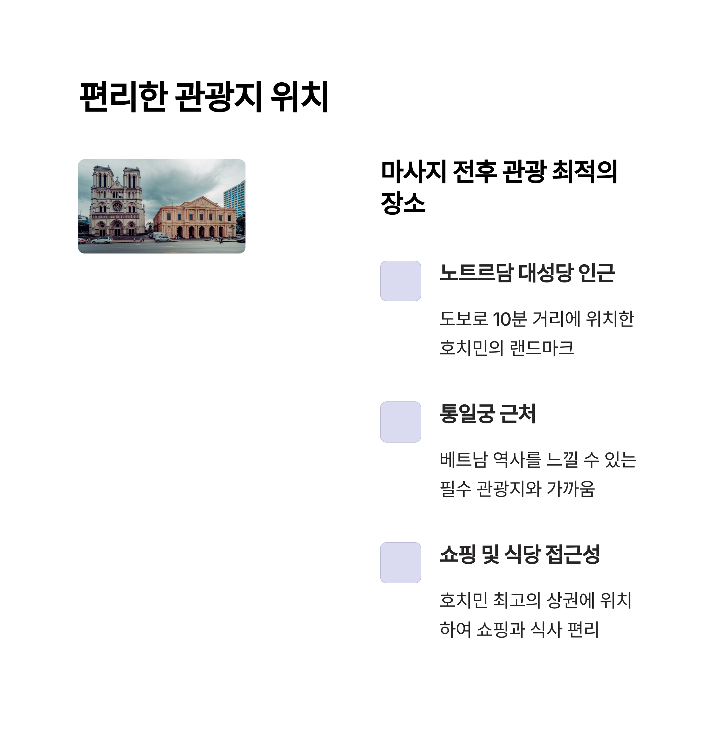 마사지와 관광을 동시에 즐기기에 최적의 선택으로, 주변 명소와도 근접해 있어 접근성이 뛰어납니다.