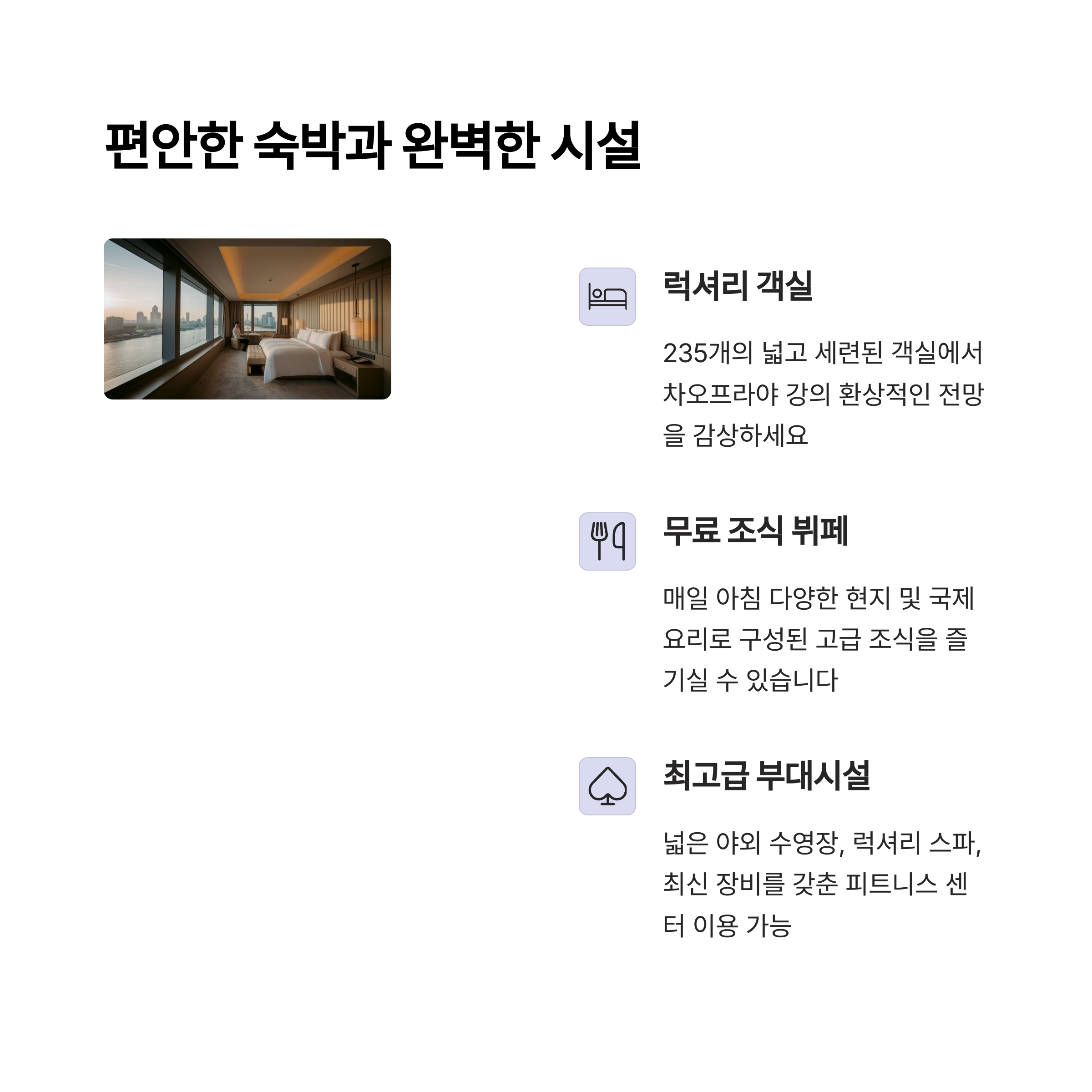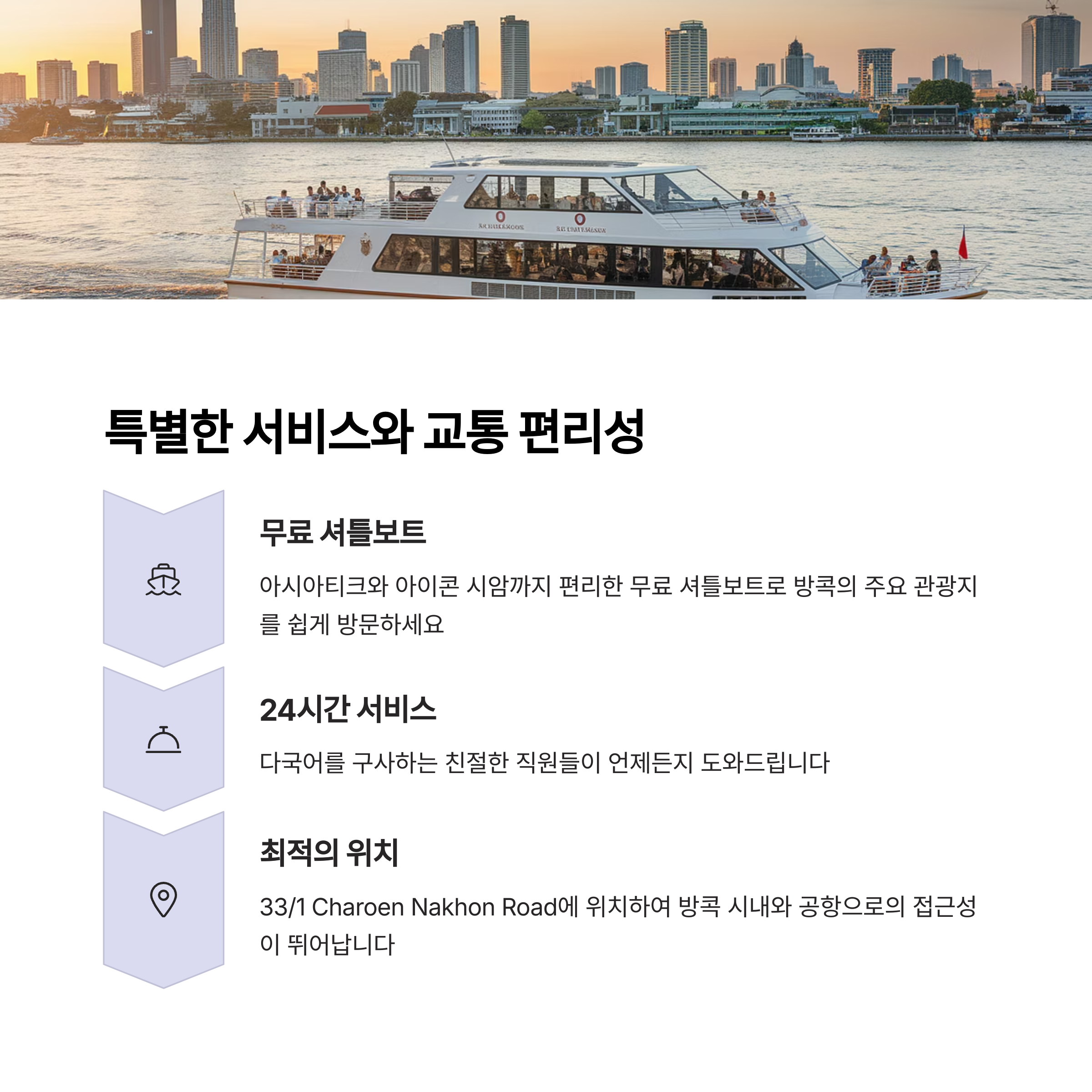 또한, 호텔에서 제공하는 무료 셔틀보트는 여행객이 아이콘 시암이나 아시아티크를 간편하게 방문할 수 있도록 돕습니다.