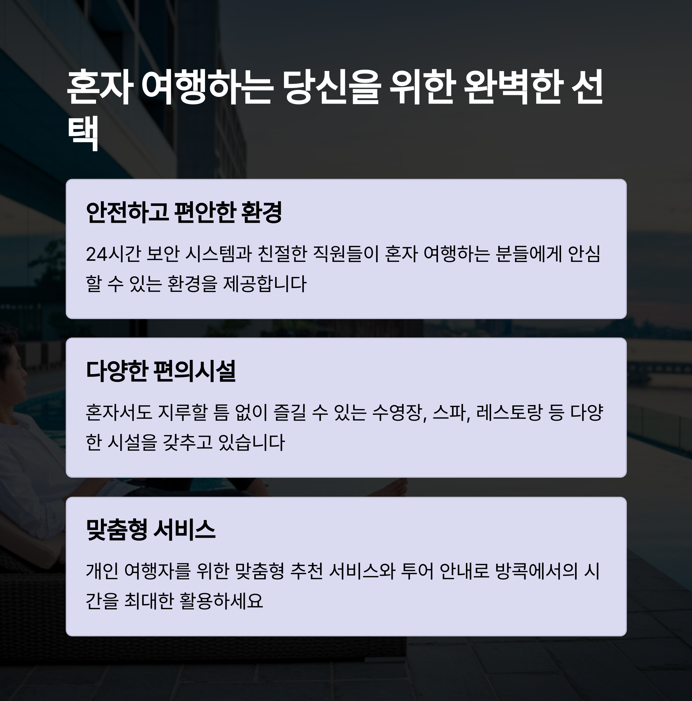 더 살릴 리버사이드는 혼자 여행을 즐기는 사람에게 여유로운 공간을 제공합니다. 차오프라야 강변의 강변 뷰는 여행의 피로를 풀어주는 이상적인 선택입니다. 호텔 내 야외 수영장은 혼자 머무르며 제대로 된 휴식을 취하기에 적합합니다. 셔틀보트를 통해 주요 관광지를 자유롭게 방문할 수 있습니다. 1박 기준 약 17만 원대로 합리적인 가격에 럭셔리한 숙박 경험을 제공합니다. |