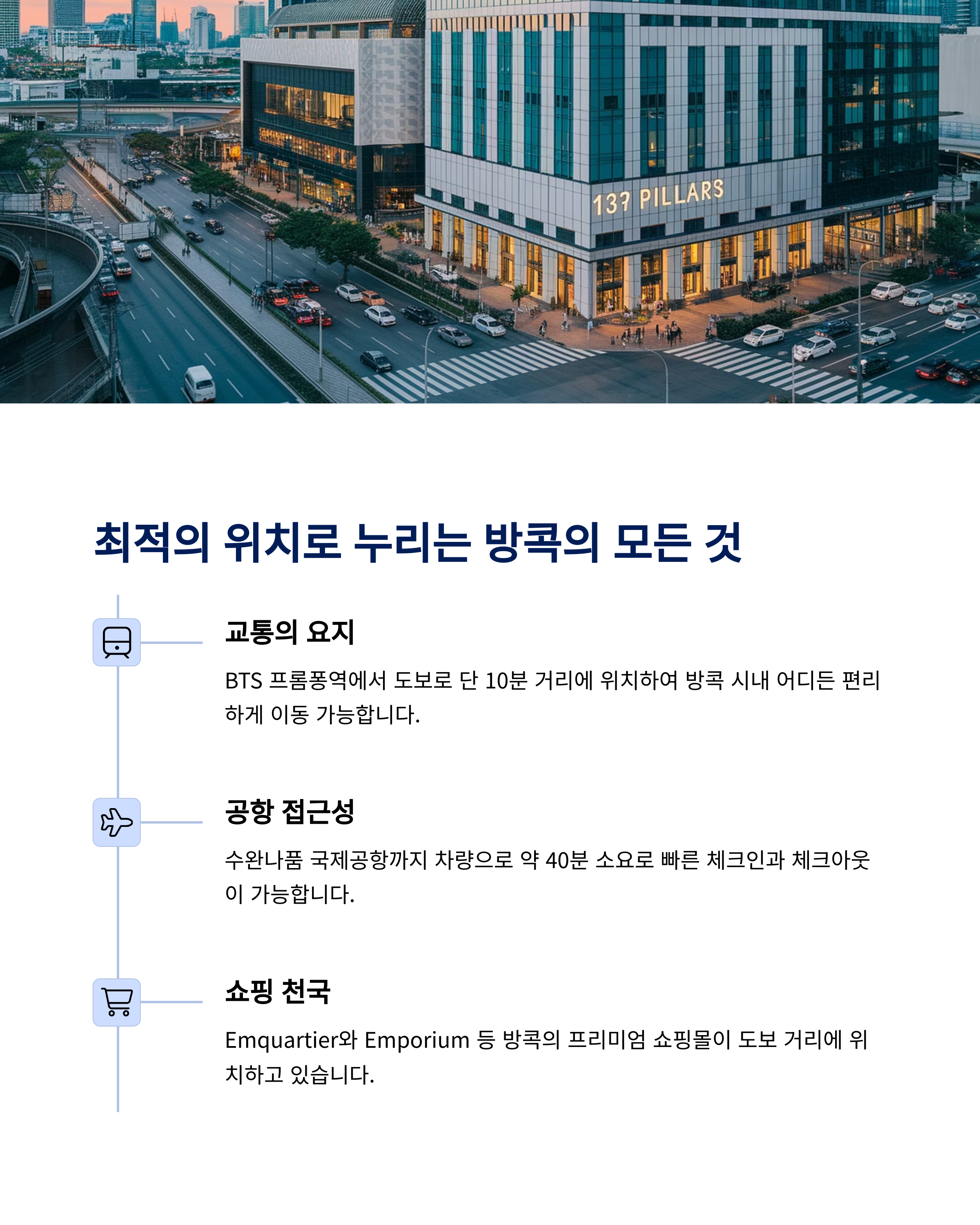 호텔의 입지 조건도 훌륭합니다. 프롬퐁 BTS역에서 도보 약 10분 거리로 접근성이 뛰어나며, 바로 근처에 Emquartier와 같은 고급 쇼핑몰이 있어서 쇼핑하기에도 편리합니다.